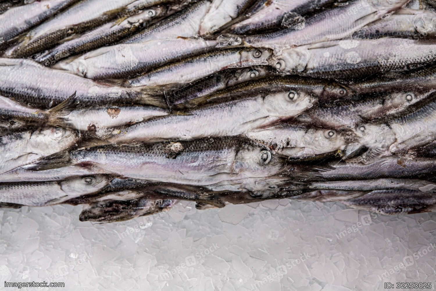 Close-up of sprat on the ice in fish market. Winter fishing. Small silver fish.