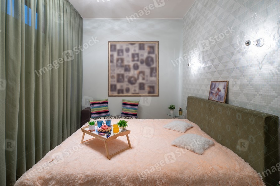 Modern interior of bedroom in studio apartment. King-size bed.