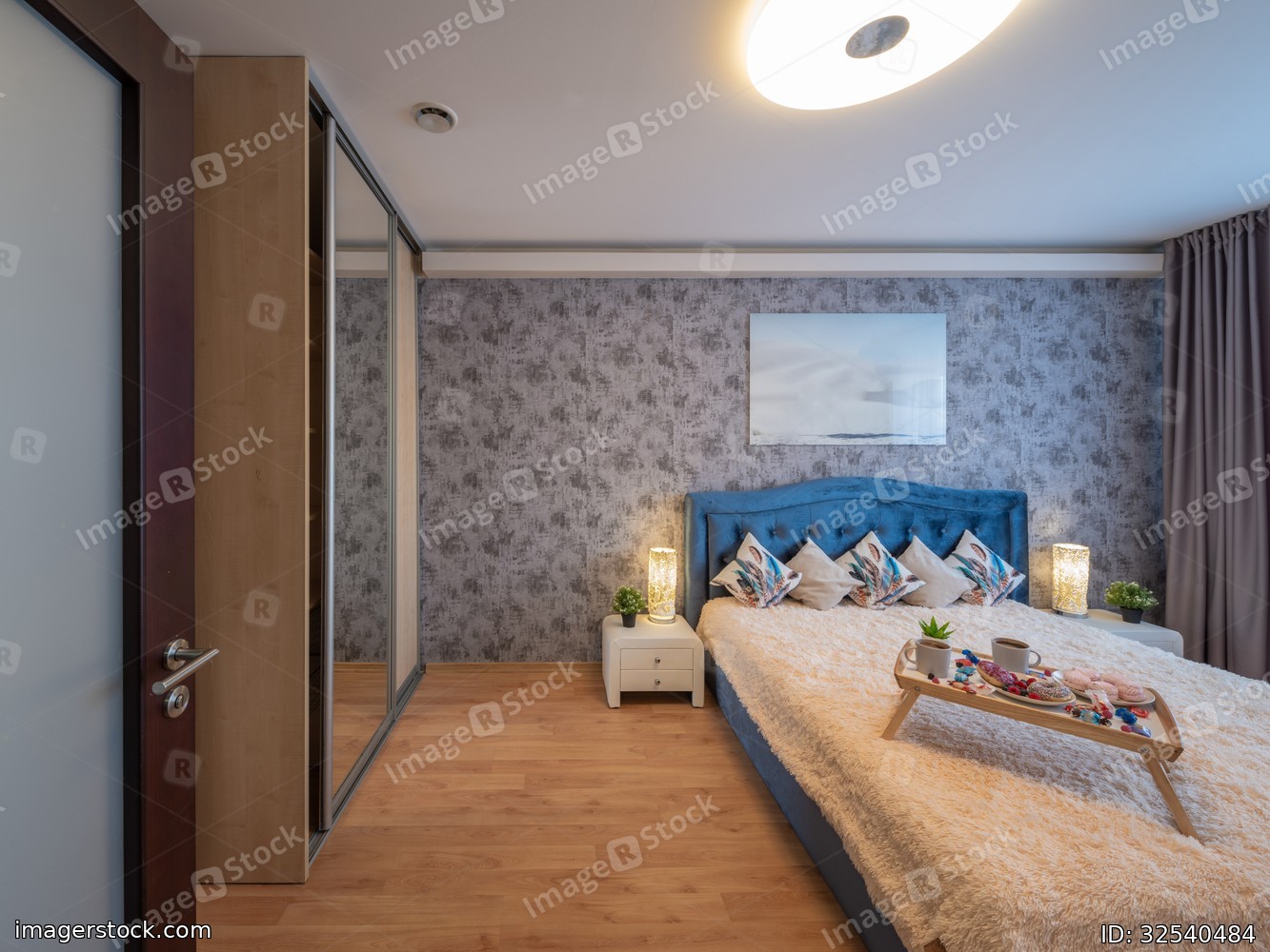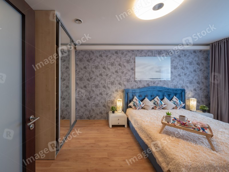 Modern interior of bedroom in luxury apartment. Breakfast on bed.
