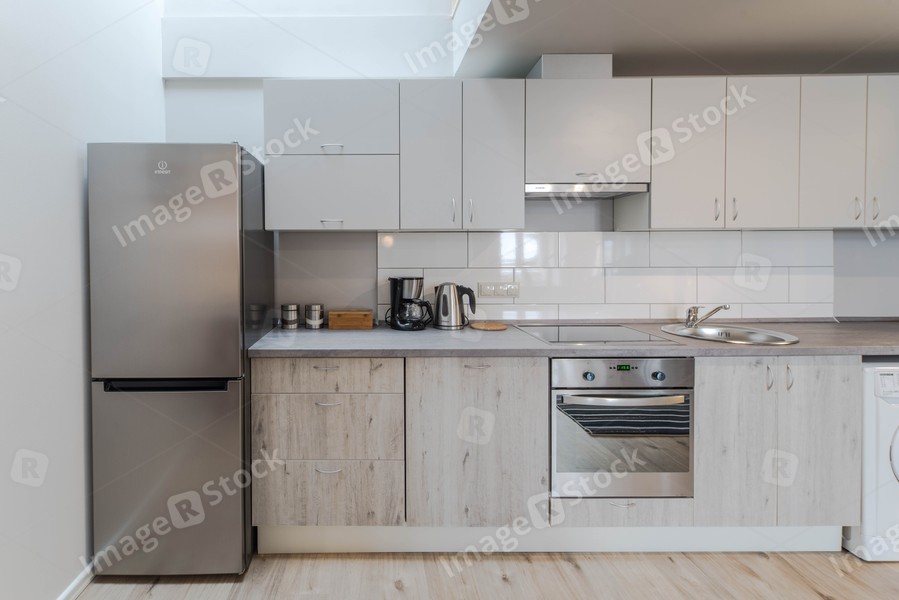 Light interior of kitchen in apartment. Private house. Light kitchen set.