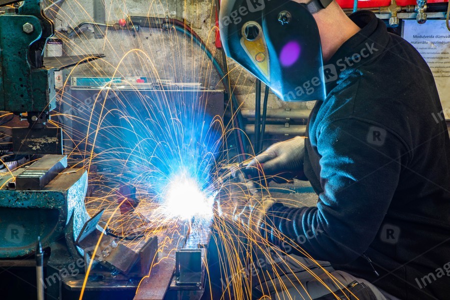 Worker in welding mask at factory. Welding process. Electric welding. Bright yellow sparks.