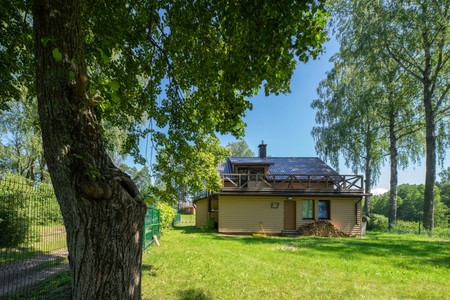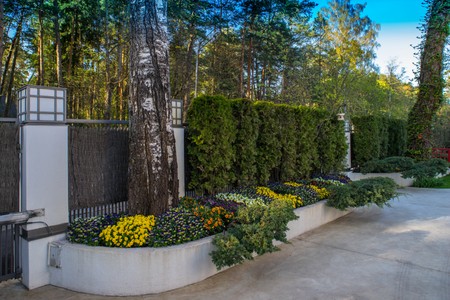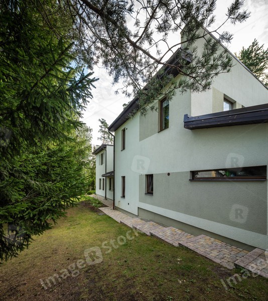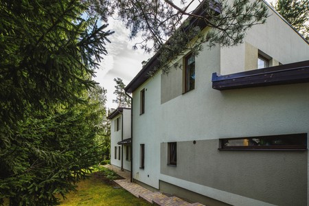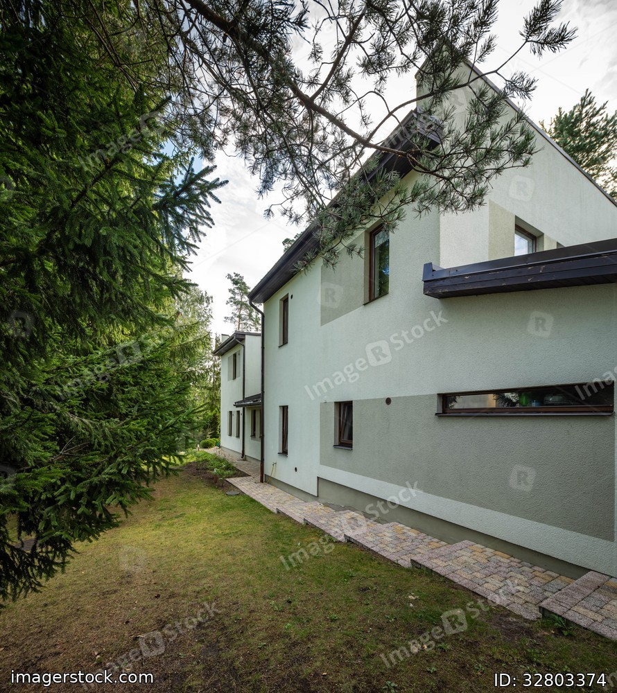 View of white wall with windows os modern private house. Contemporary exterior. Cottage near trees.