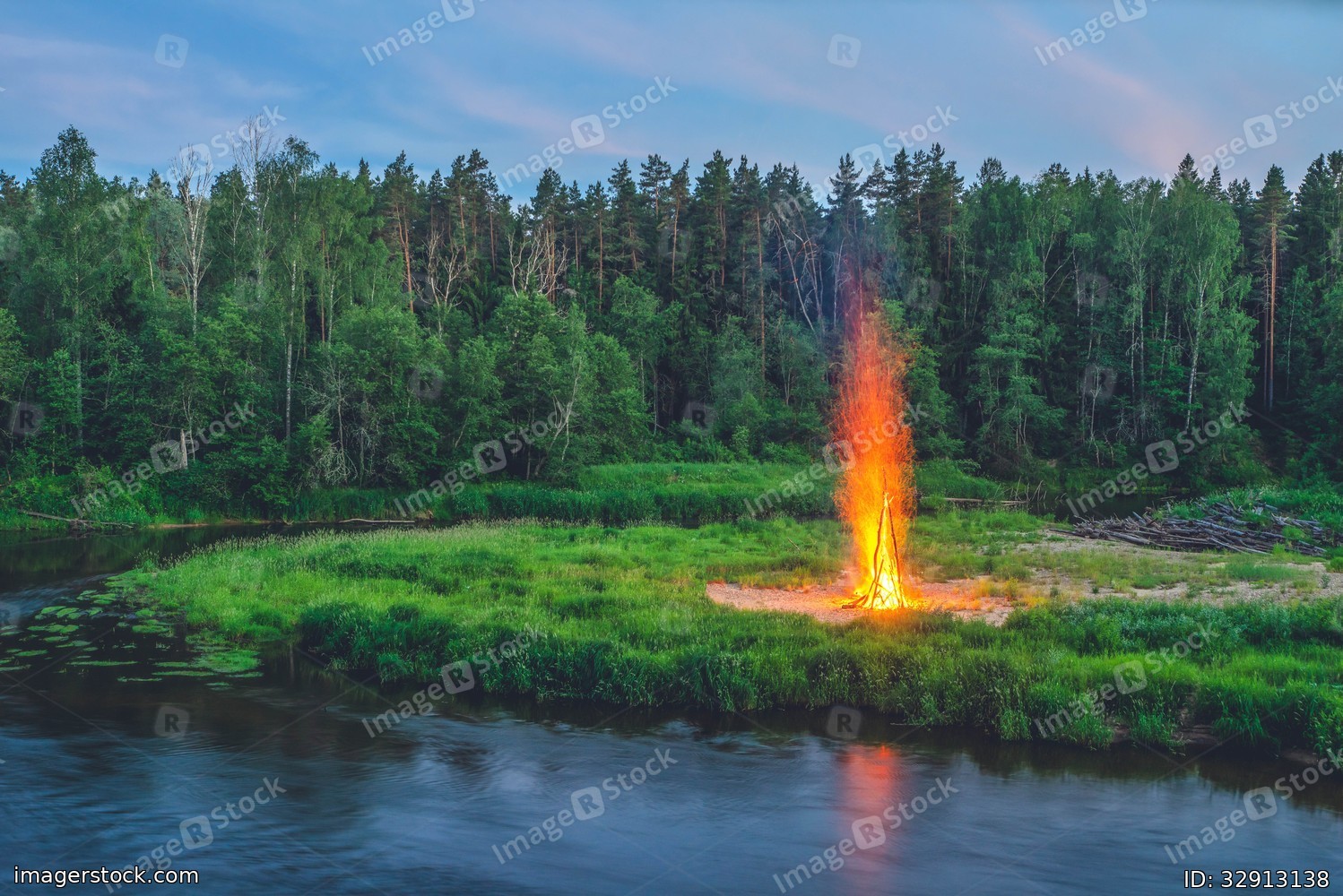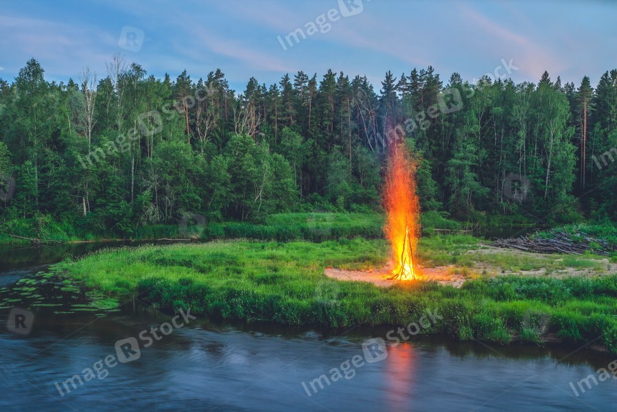 Landscape of forest and river at twilight. Huge fire. Midsummer Ligo celebration in Latvia.
