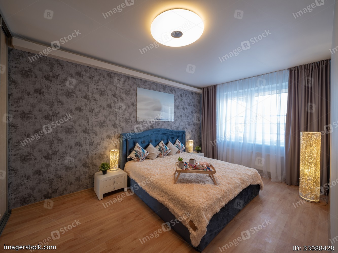 Modern interior of bedroom in luxury apartment. Breakfast on bed.