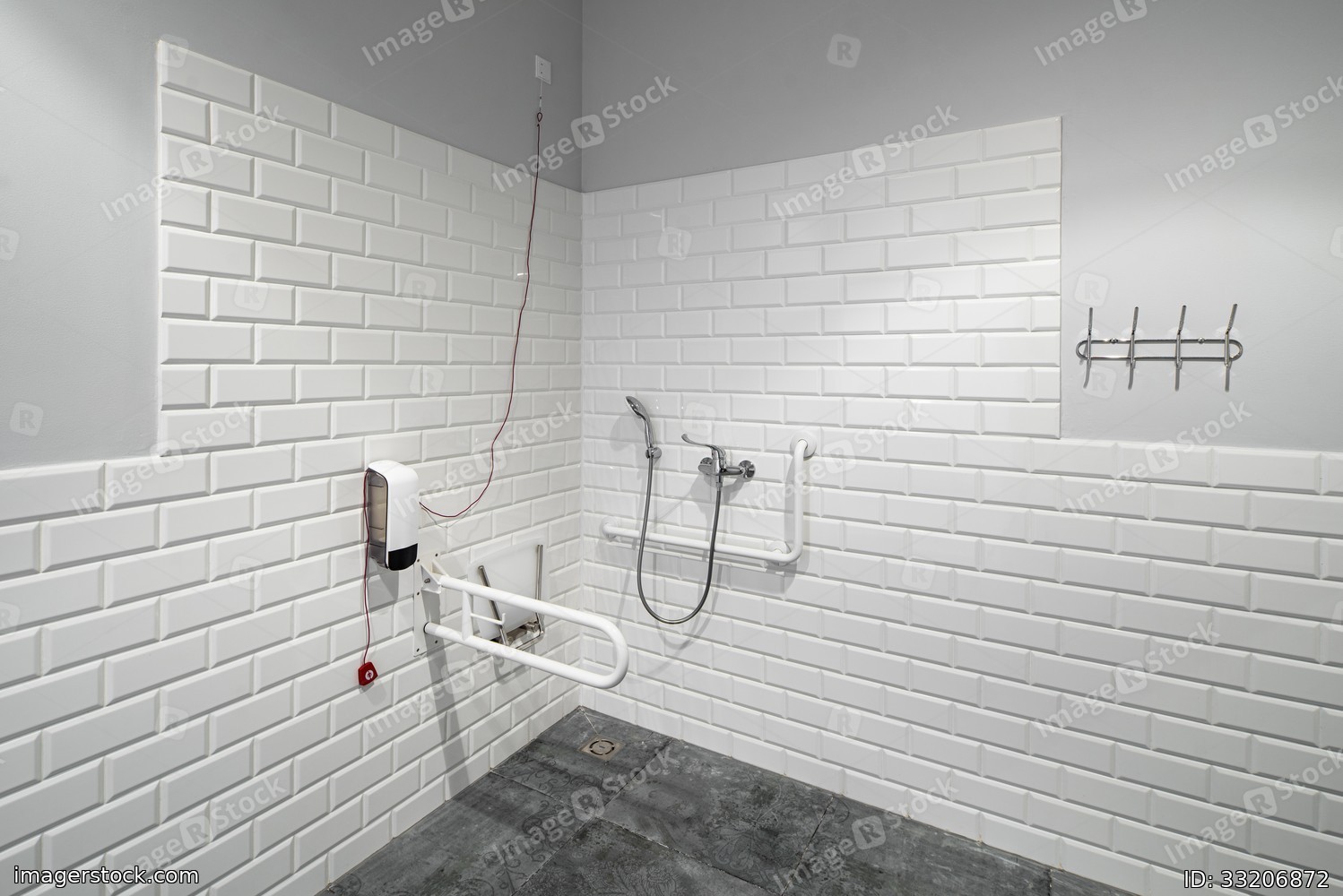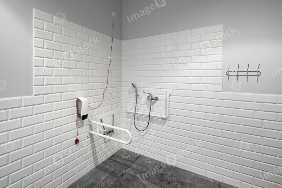 The interior of bathroom with facilities for the disabled. Shower. White bricks. Grey tile.
