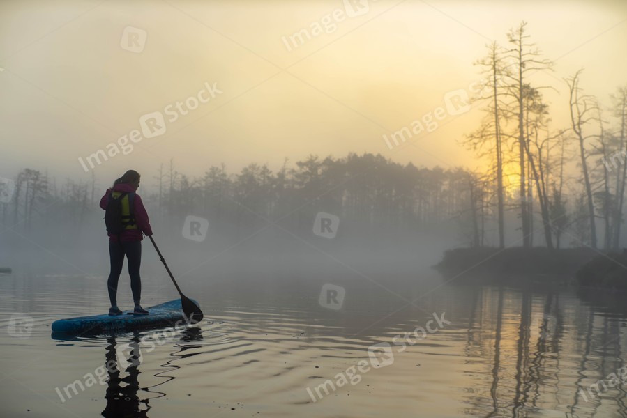 Woman slowly floating on the water on the sup-board. Fog and swamp.