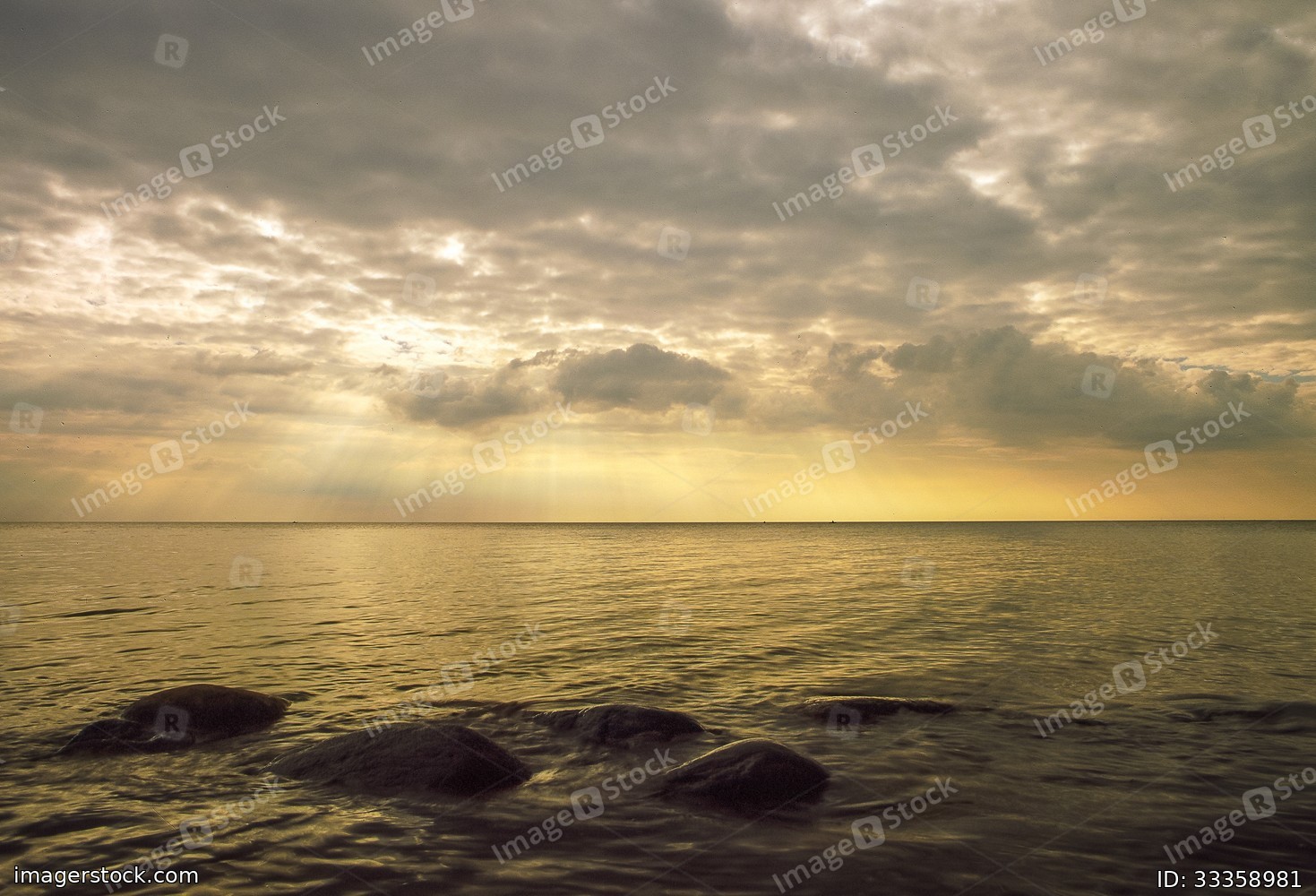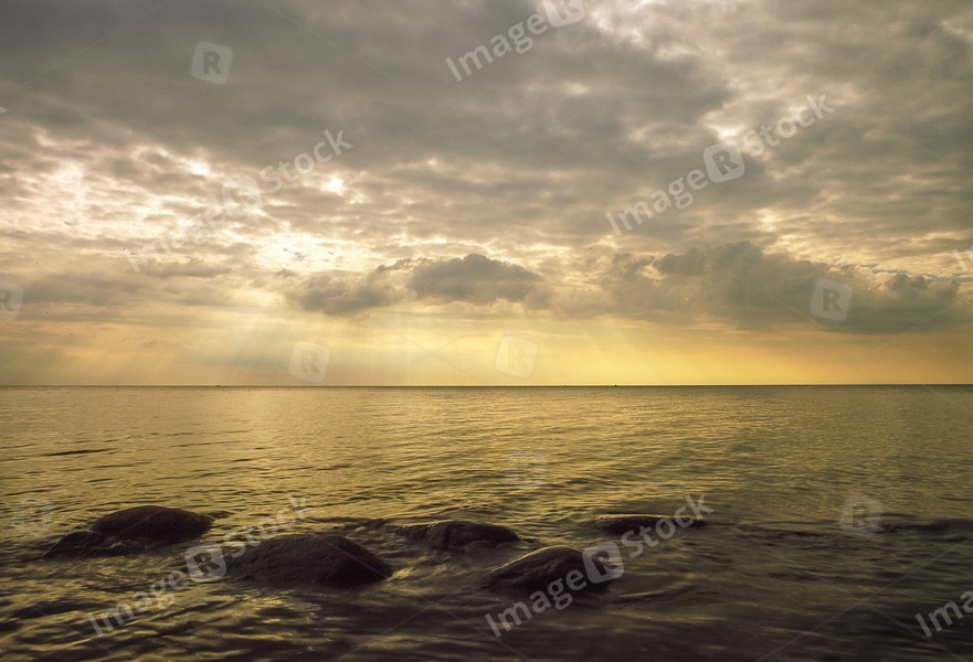 Rocky shore. Stones in the sea waves. Beautiful clouds.