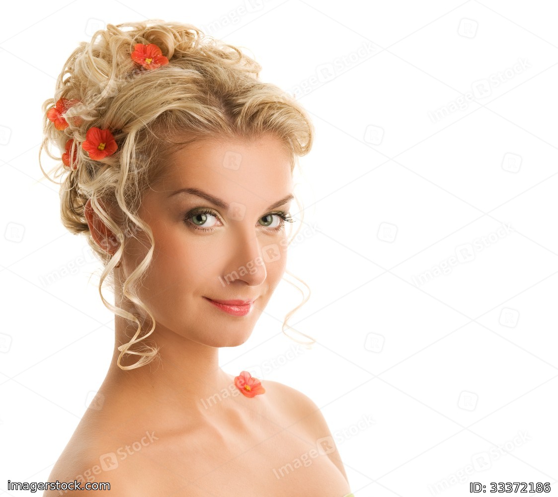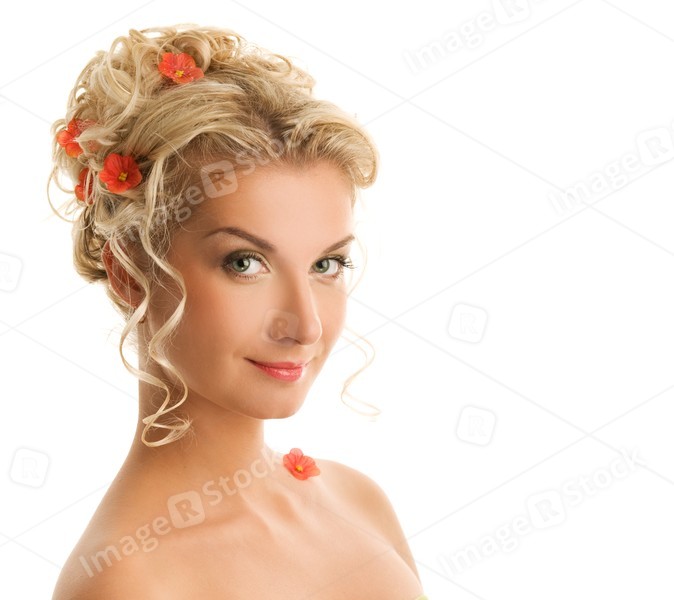 Beautiful young woman with flowers in her hair close-up portrait