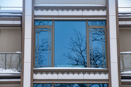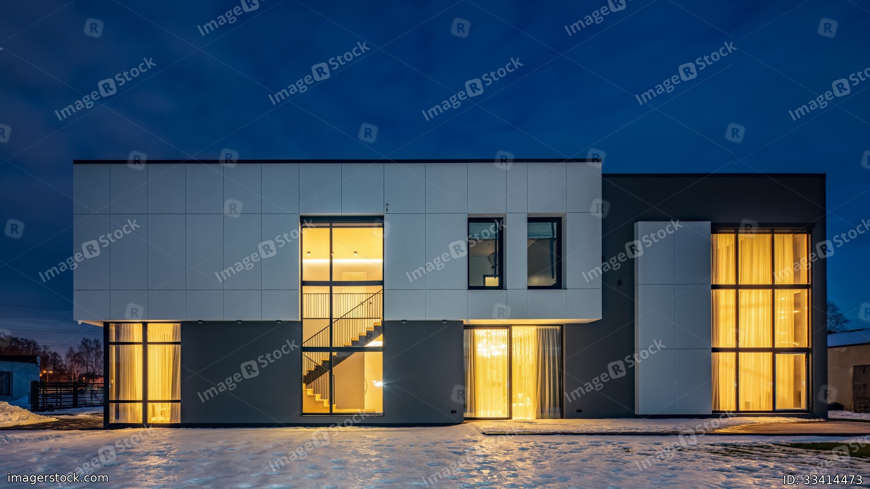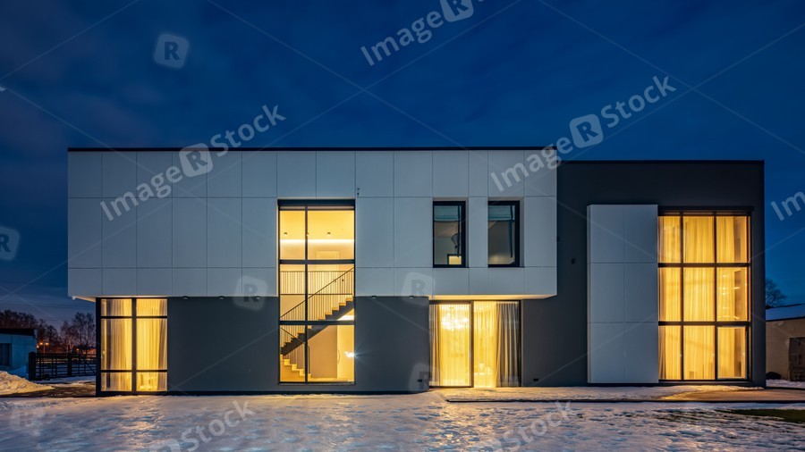 Exterior of luxury private house. Modern cottage at evening.