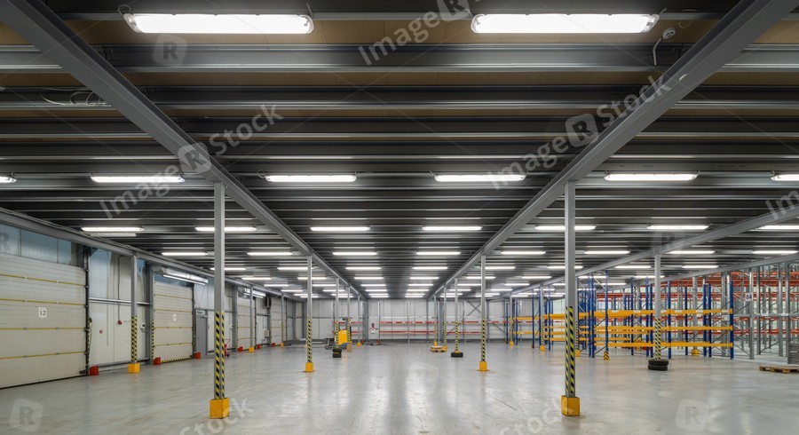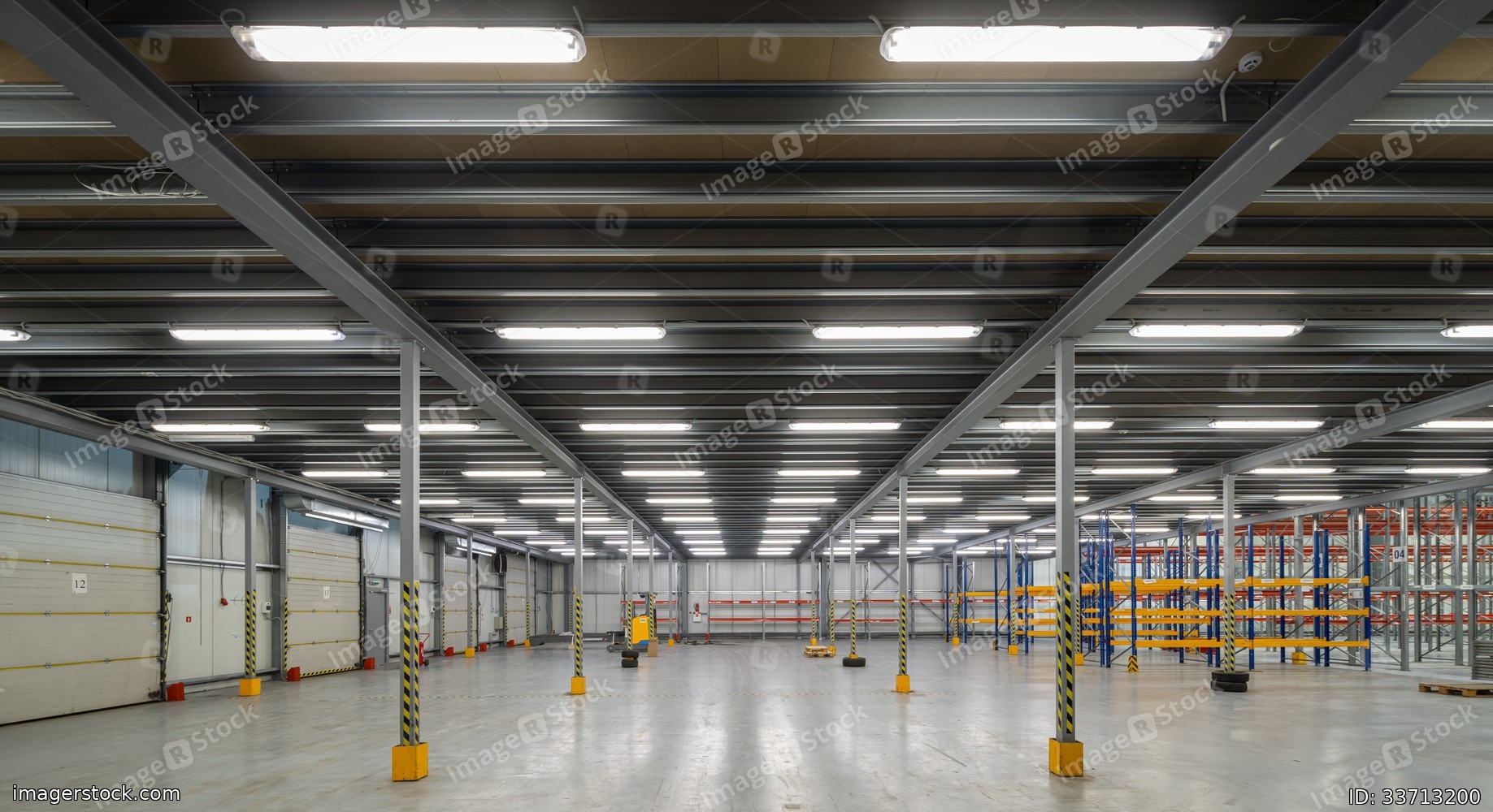 Interior of huge empty storehouse. Industrial warehouse racking.