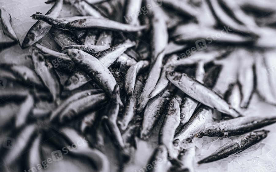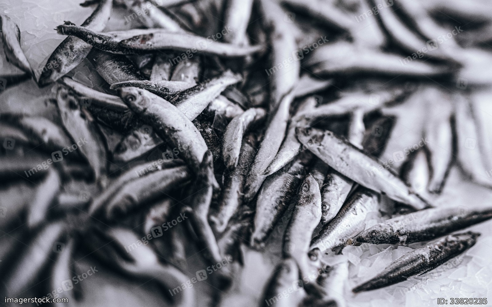 Close-up of fresh sprat on the ice in fish market. Winter fishing. Small silver fish production.