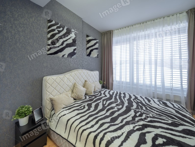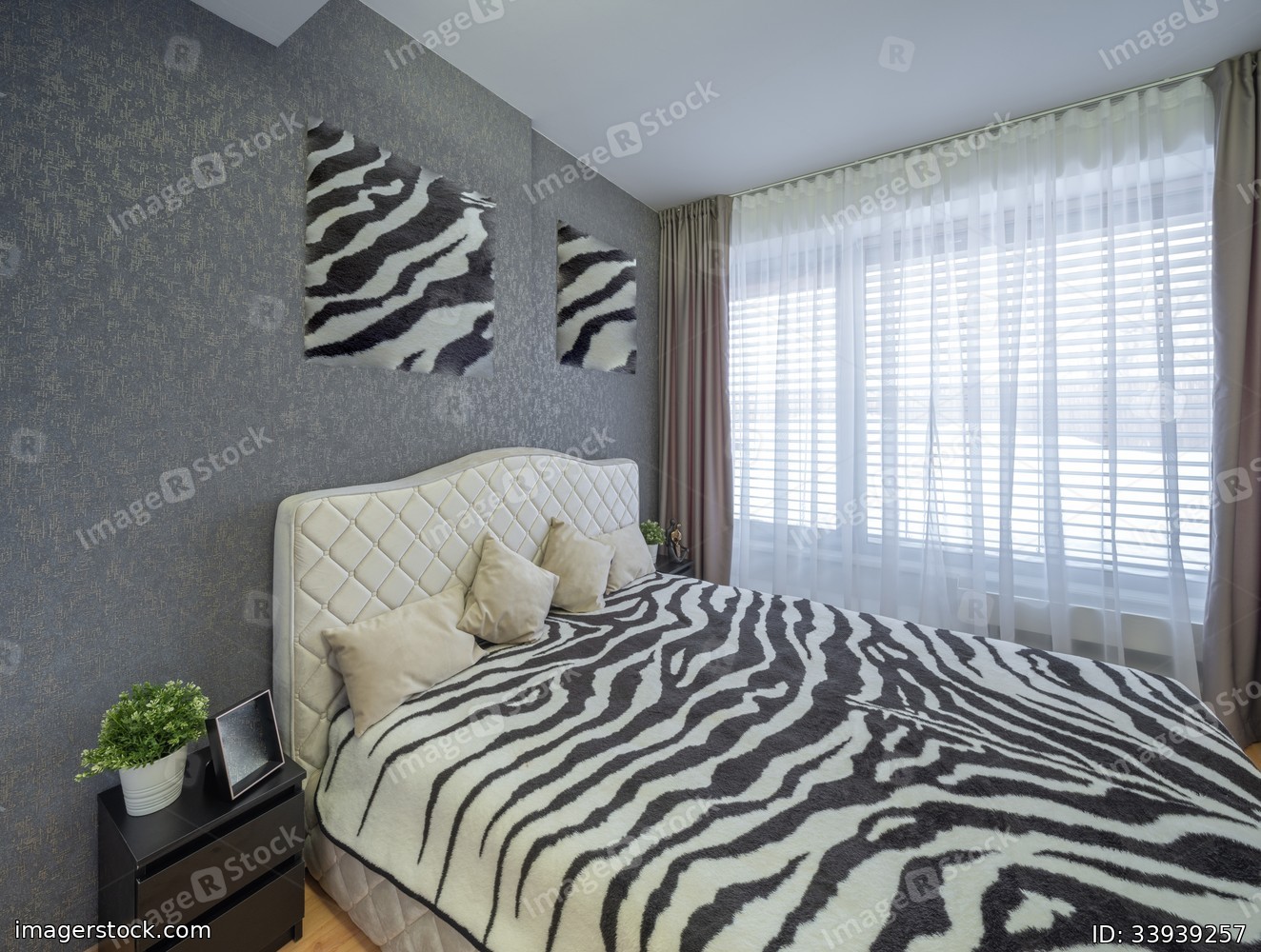 Modern interior of bedroom in luxury cottage. Zebra print bedspread.