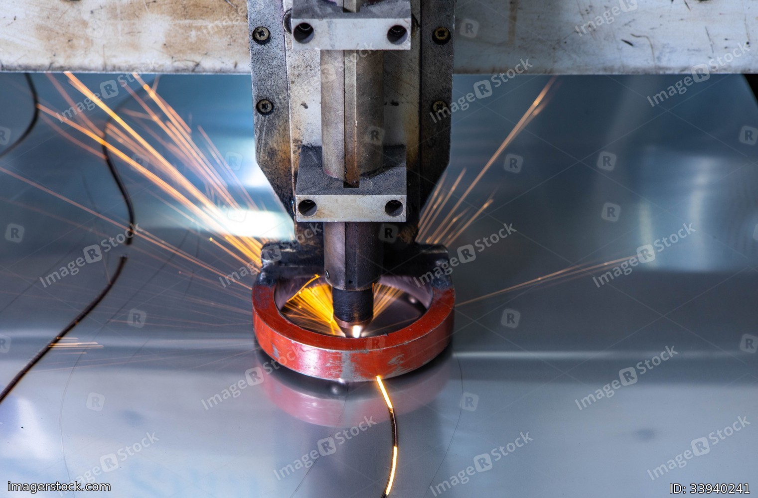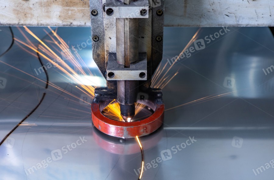 Plasma cutting of metal. Sparks fly from laser.