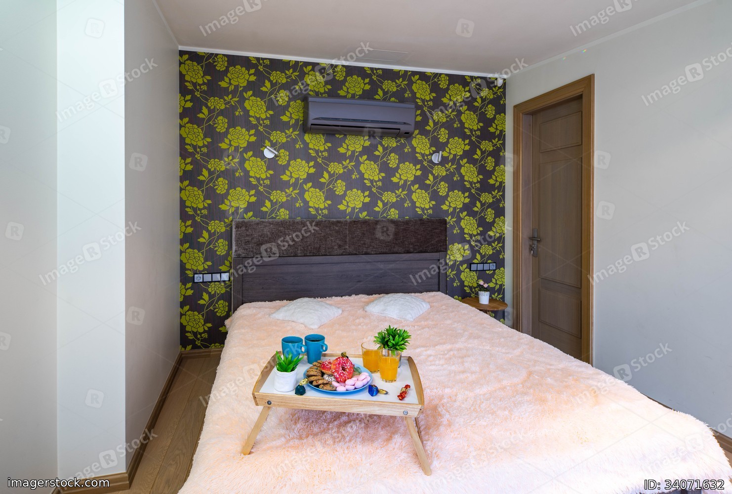 Bedroom in modern apartment. Interior. Light spacious room. King-size bed.
