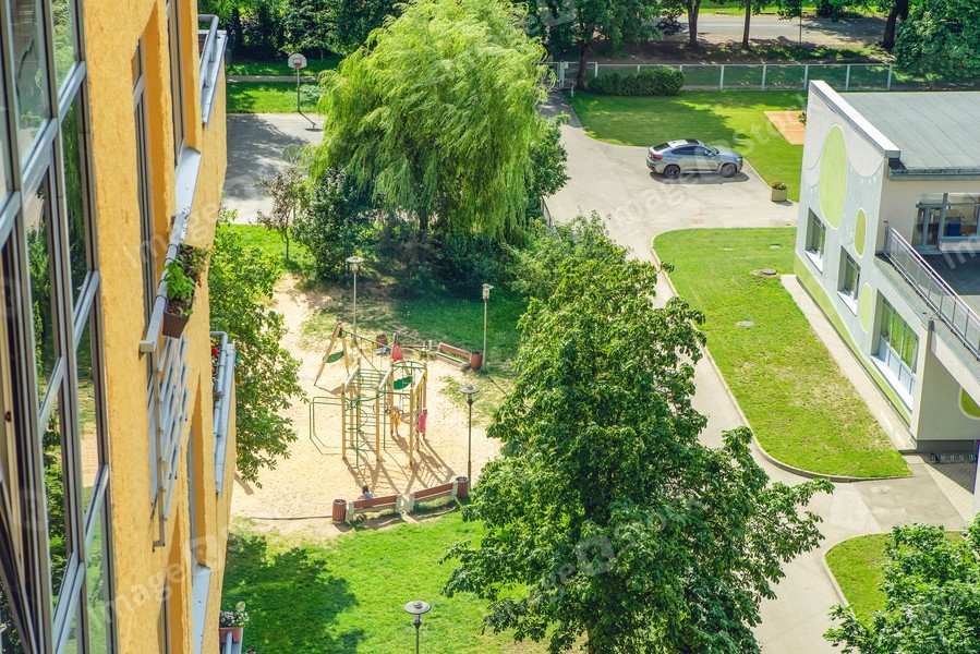 Sunny summer cityscape. Top view of modern architecture building. Kids playground. Green trees. Parking car.