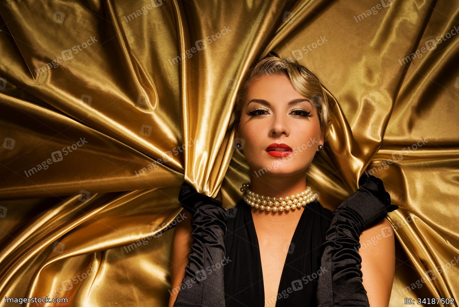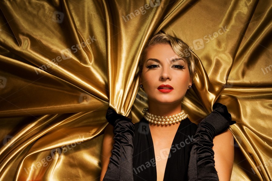 Lovely woman on golden fabric retro portrait