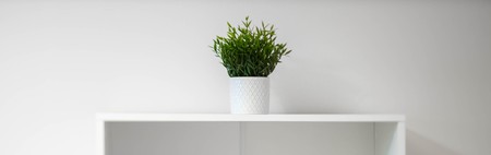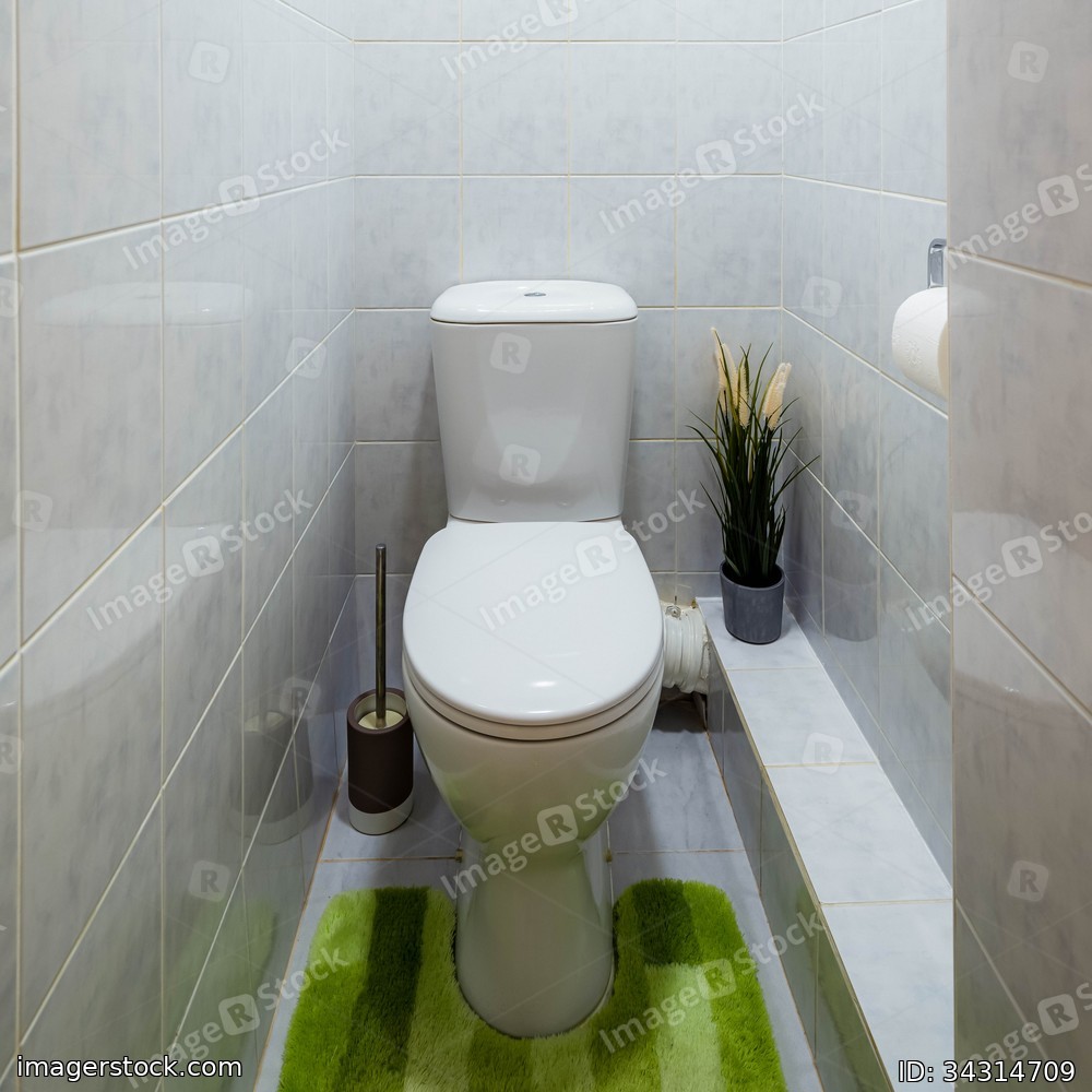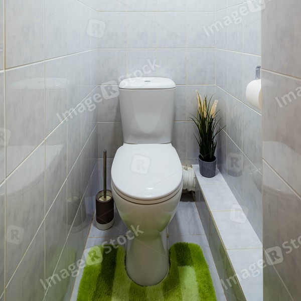 Interior of small toilet room in flat. White tile. Decorative plant. Green mat.