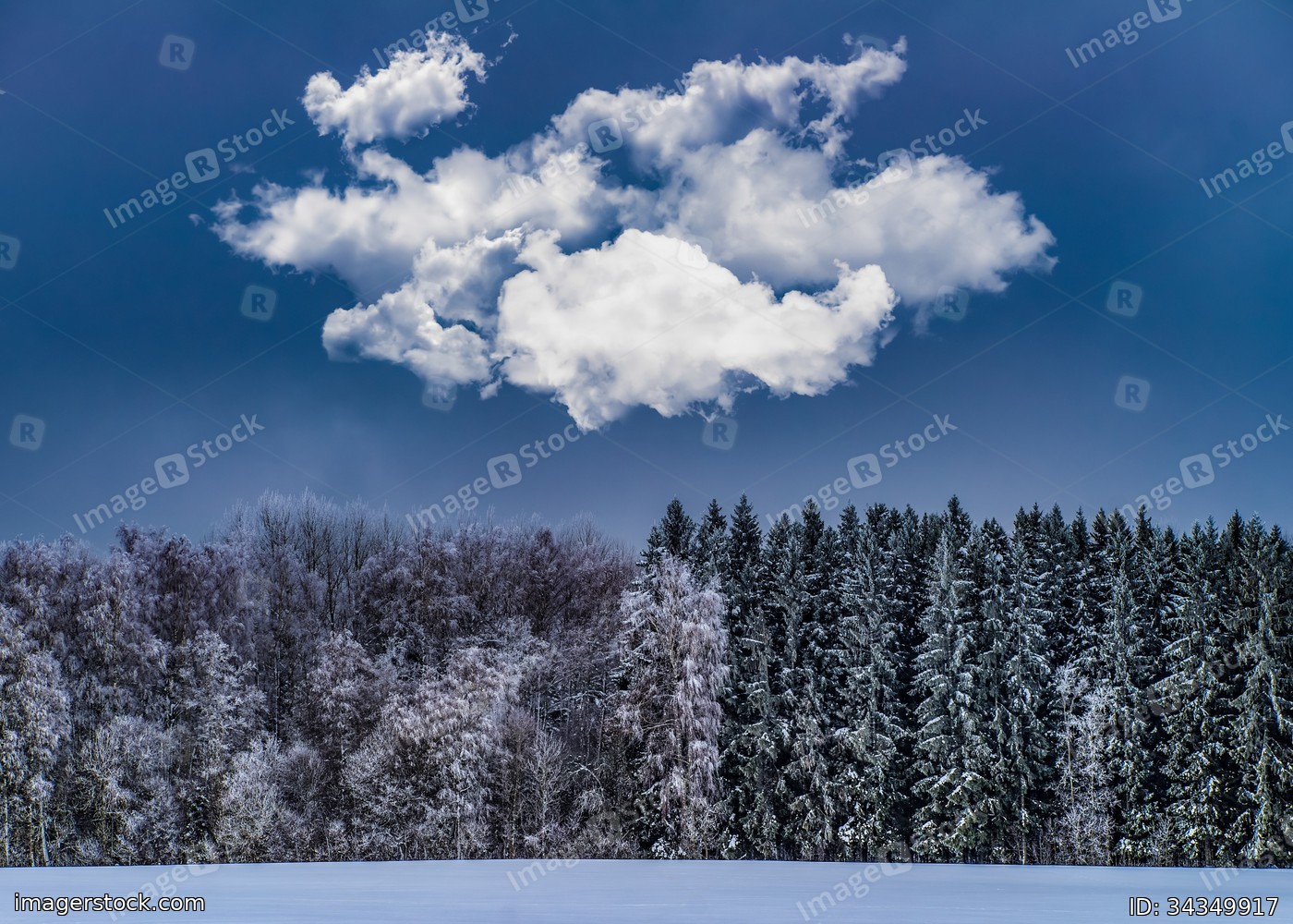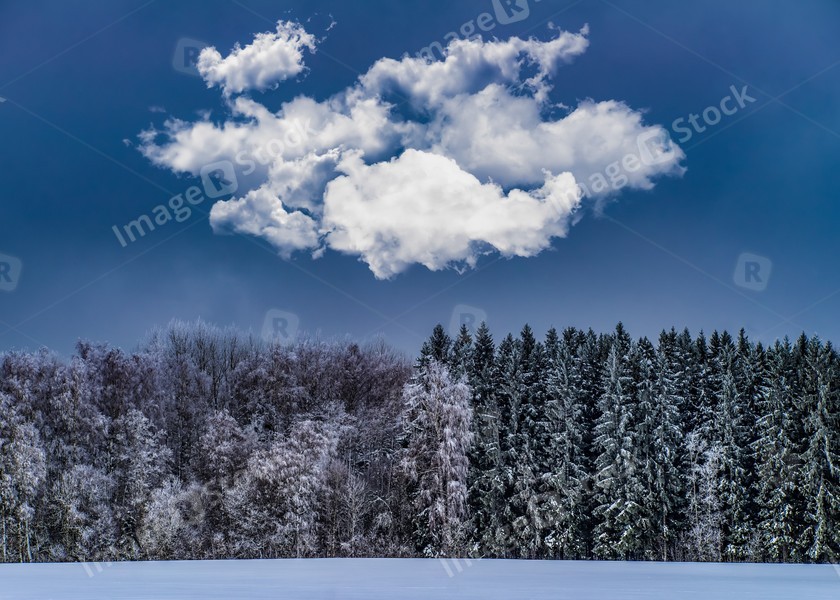 Beautiful winter landscape. Snowy forest. Cloud in sky.