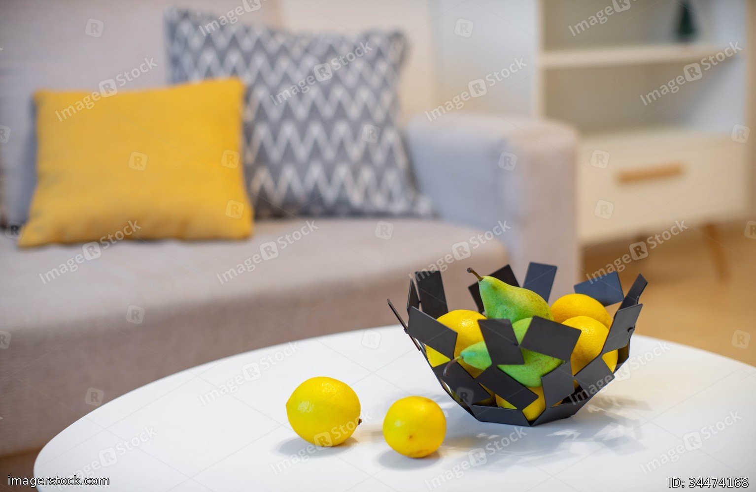Close-up of decorative bowl with fruits on white table. Lemons and pears. Modern interior. Cozy sofa with cushions.