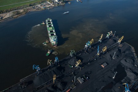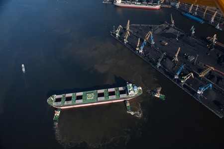 River port, loading of peat. Riga. View from above. Aerial Landscape.