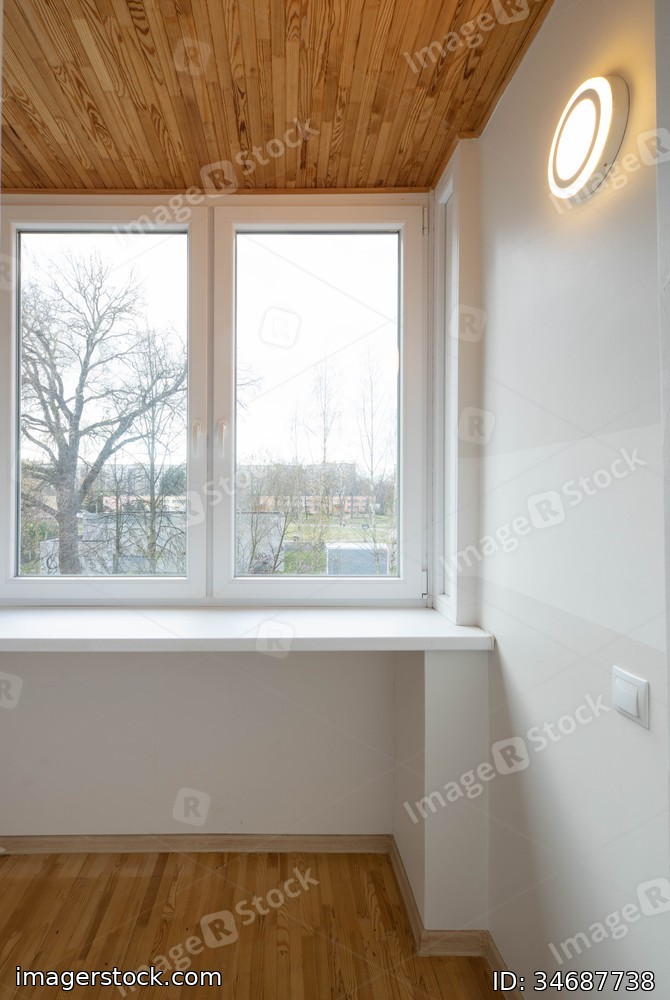 Modern interior of empty room in private house. Wooden floor and ceiling. Lamp on white wall.