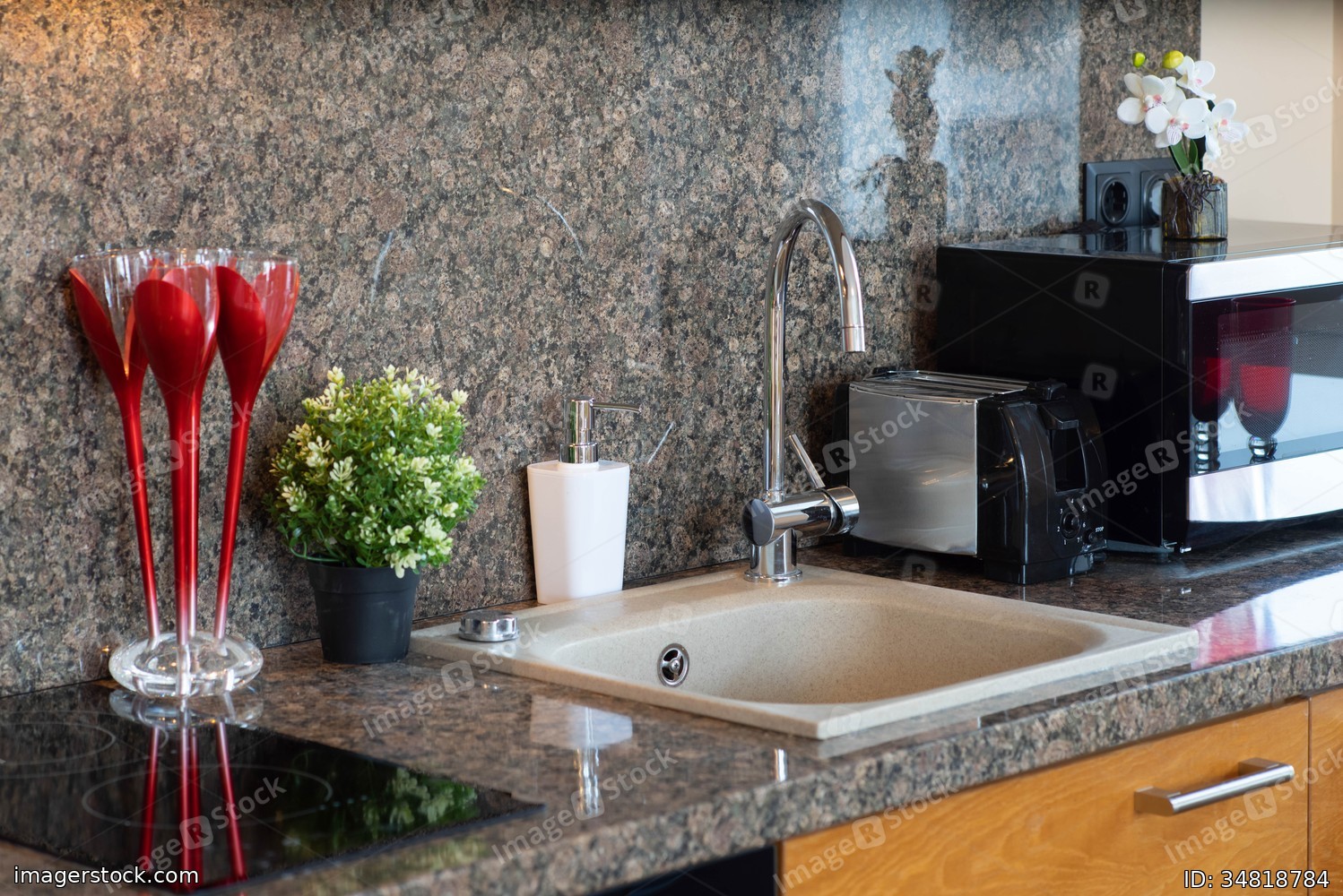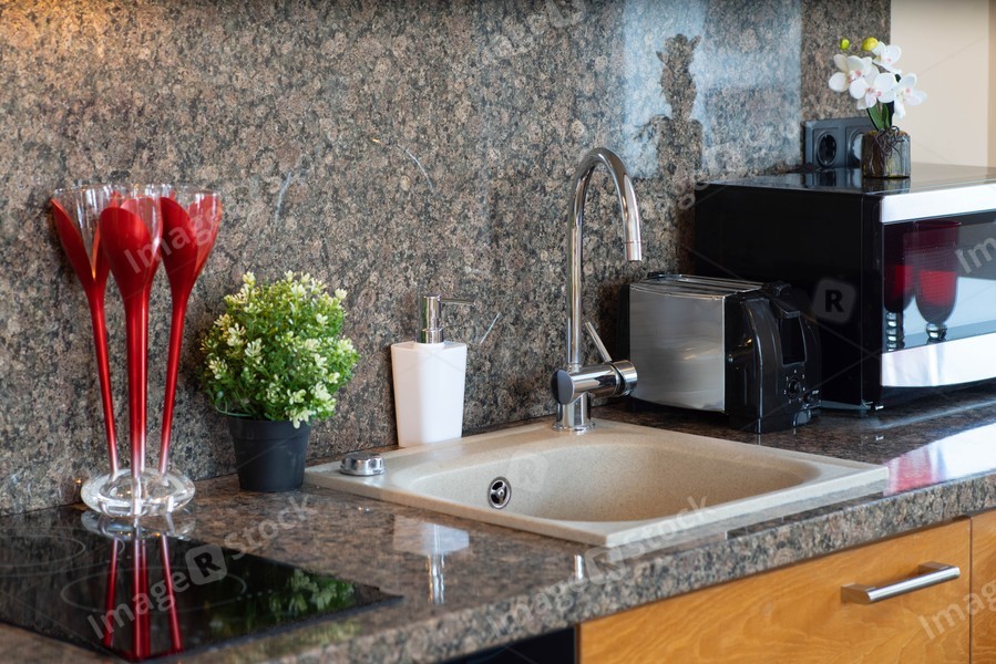 Close-up of the kitchen set in apartment. Home appliances. Sink and soap.