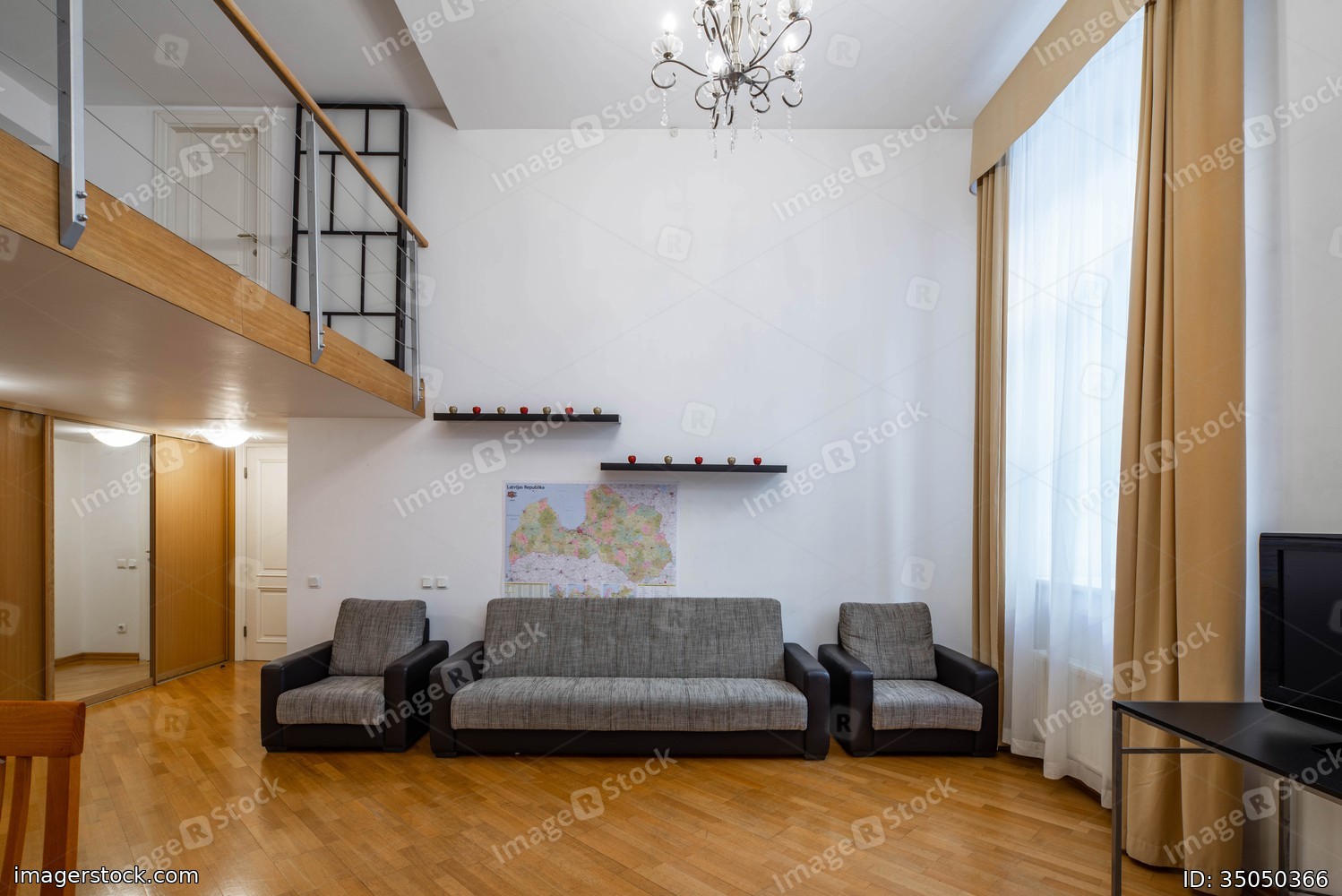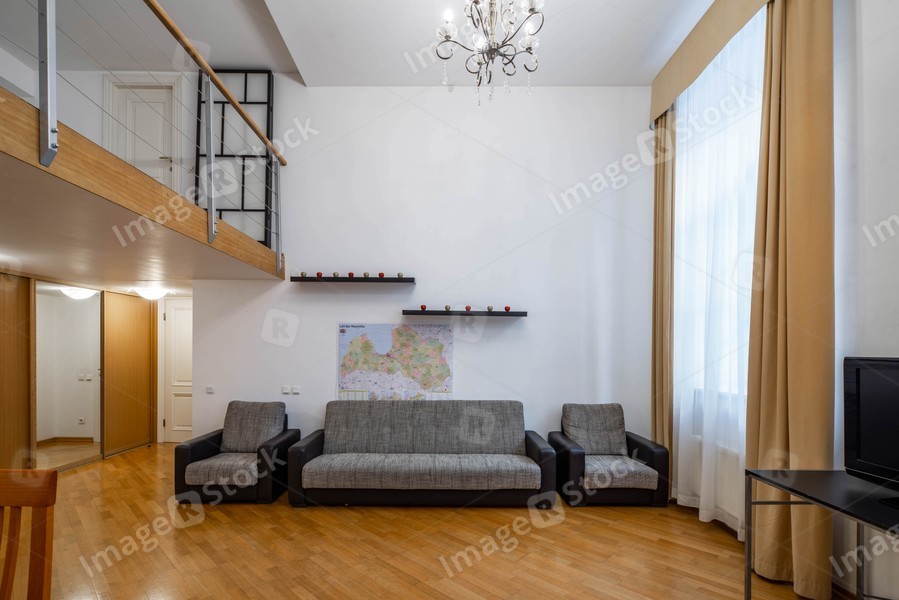 Modern interior of studio apartment. Wooden table. Cozy couch.