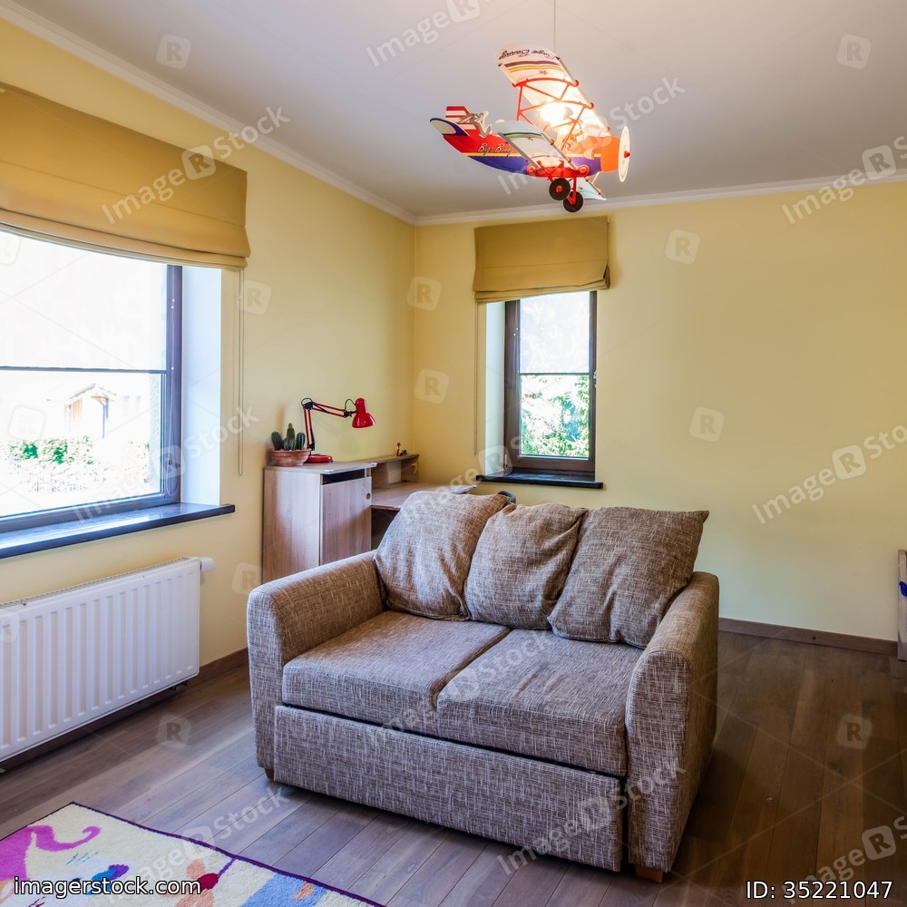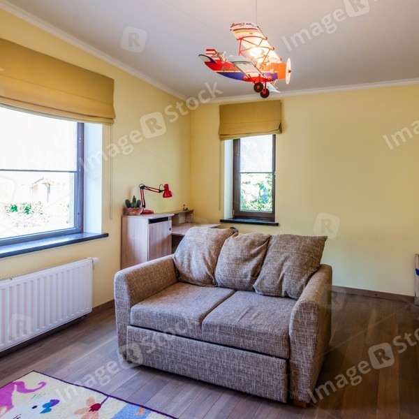 Modern interior of children`s room in flat. Cozy furniture. Small wooden bed. Yellow walls.