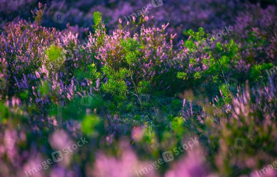 Sunny day. Blooming heather. Beautiful lawn in the forest.