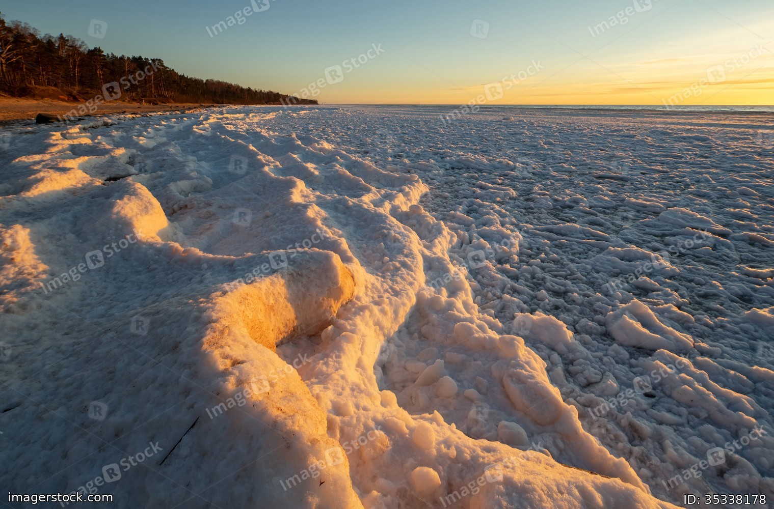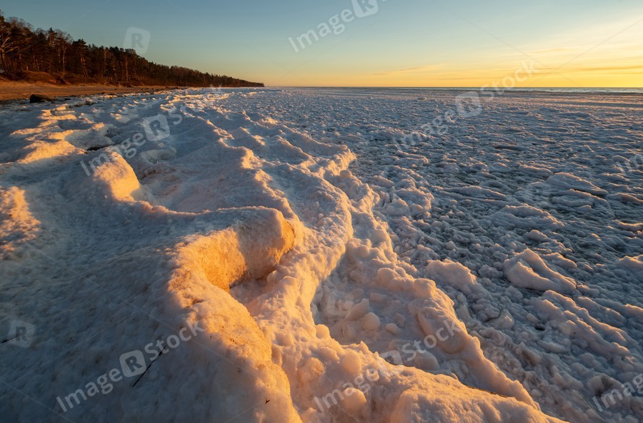 Snow and ice in sunset light on Baltic sea shore. Winter nature.