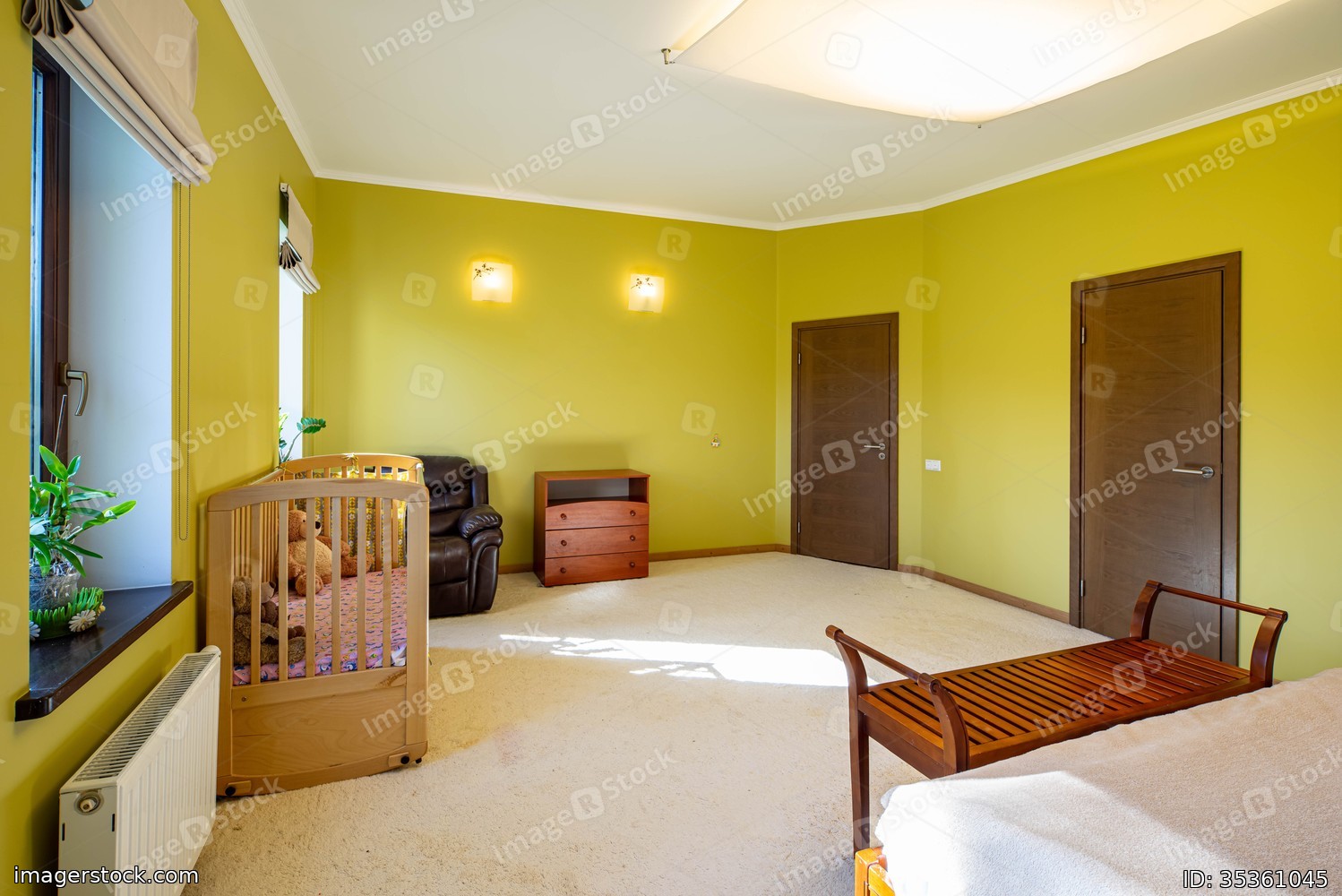 Spacious bedroom in private house. Modern luxury interior. Wooden dresser. Leather chair. Baby bed.