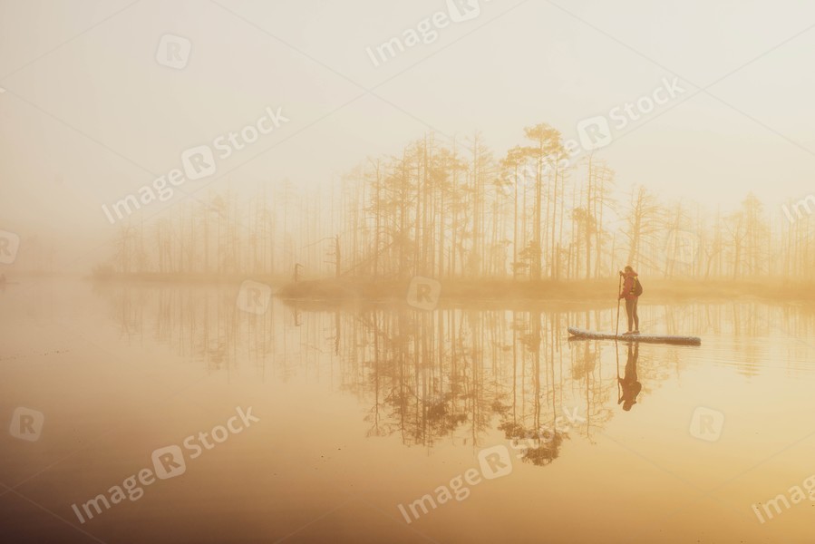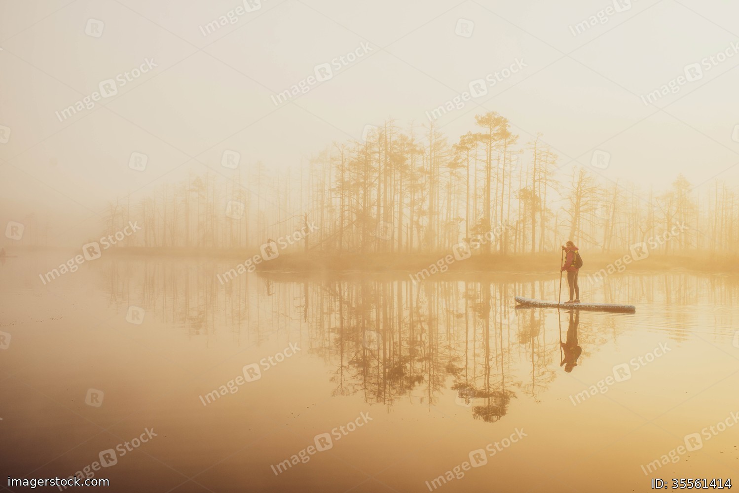Woman slowly floating on the water on the sup-board. Fog and swamp.
