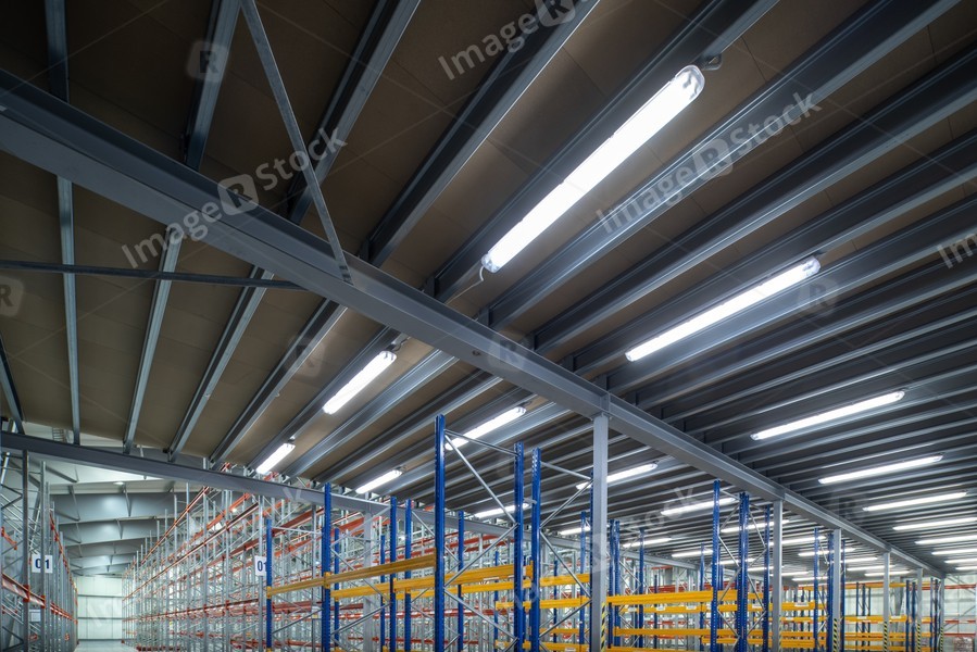 Interior of huge empty storehouse. Industrial warehouse racking.