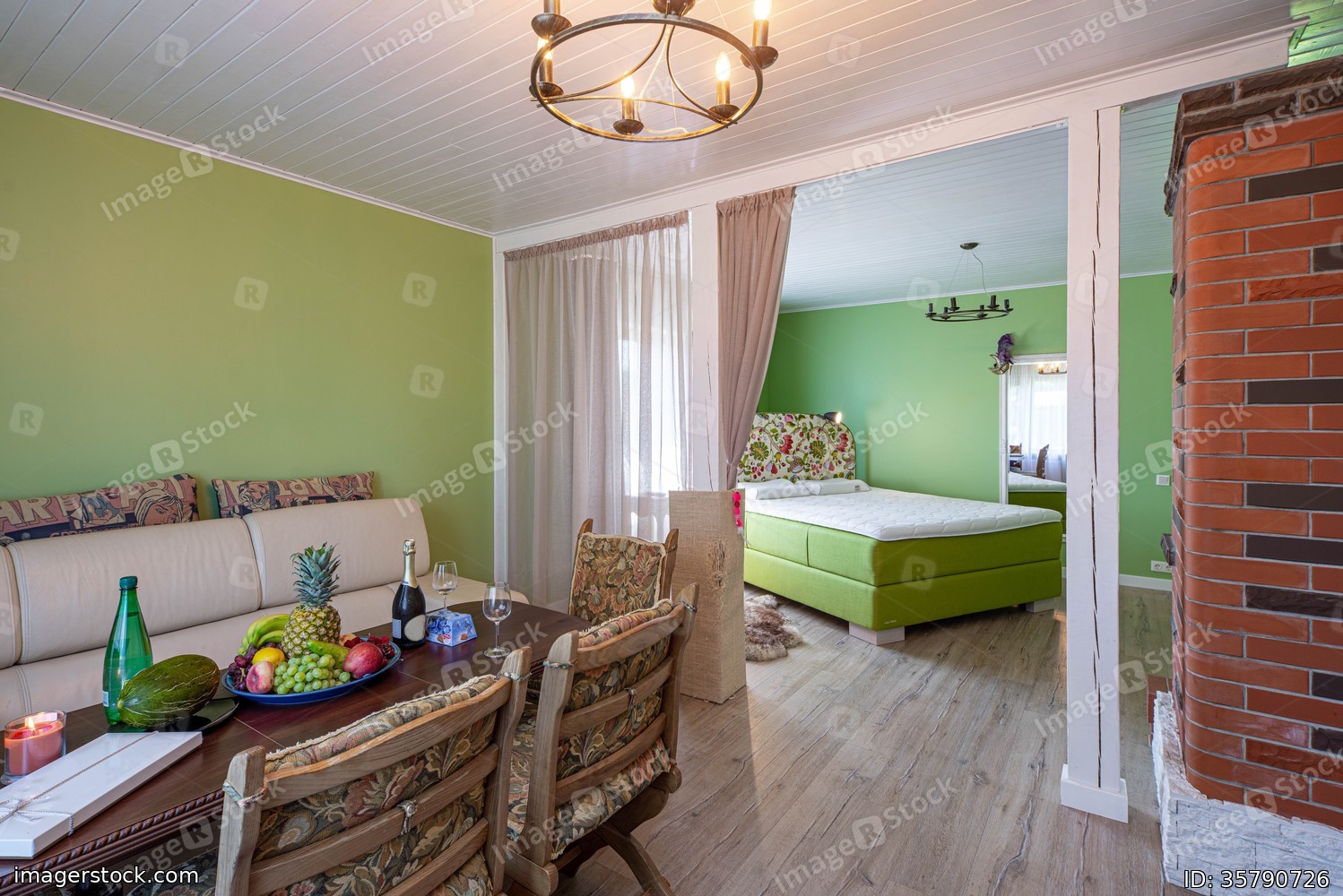 Contemporary interior of country private house. View of cozy bed with pillows. Green walls. Set table.