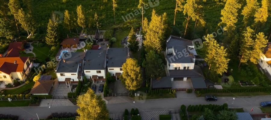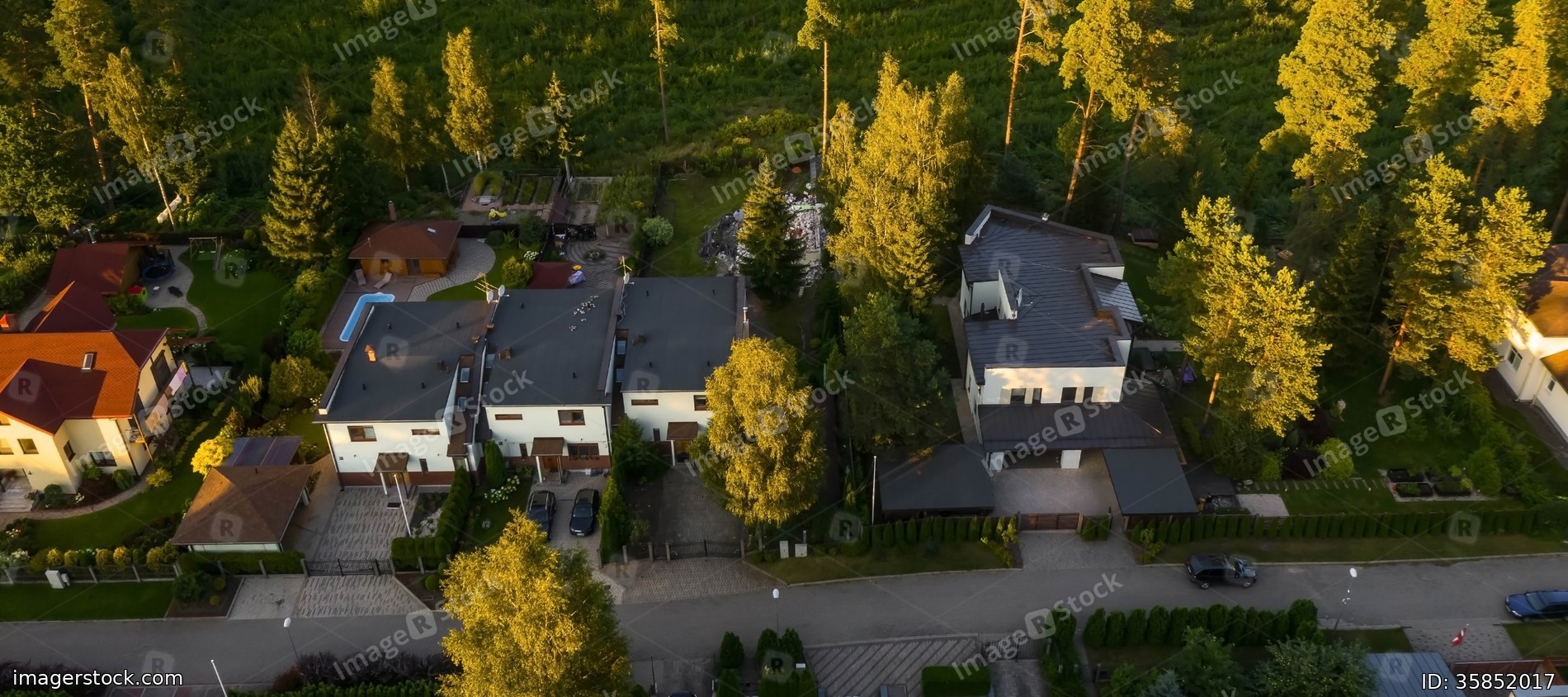 Top drone view of of private sector of city. Modern architecture. Green grass and trees. Road with cars.