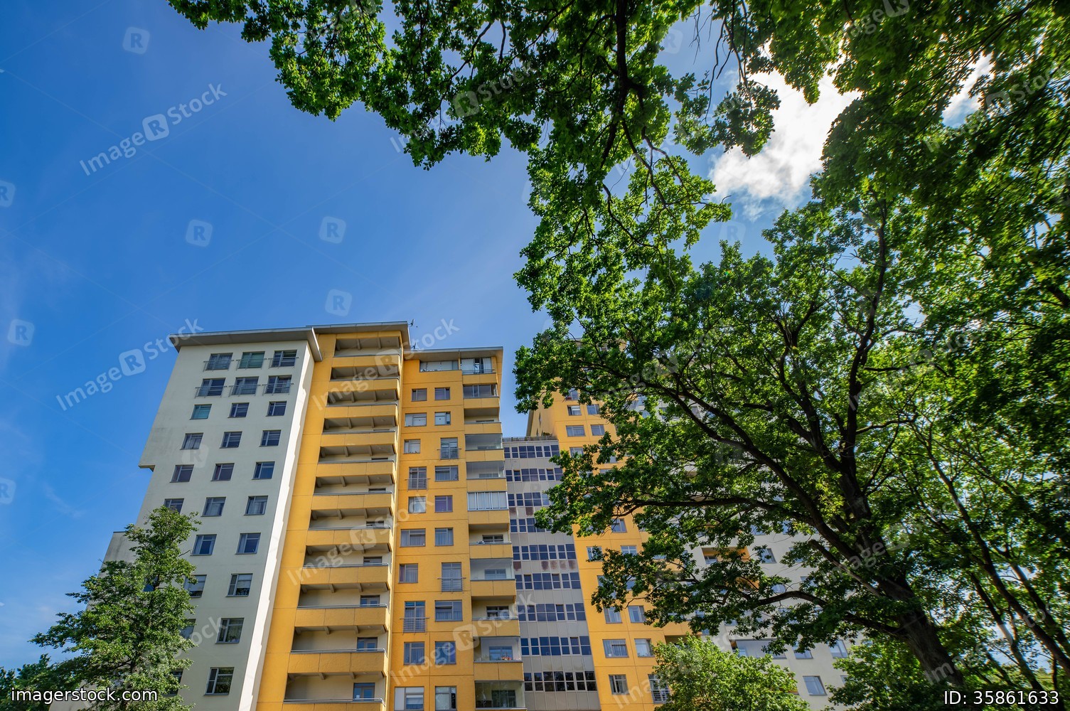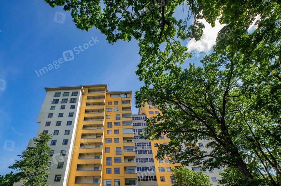Modern exterior of residetial building. Urban arcitecture. Parking cars. Sunny summer day. Green grass and trees.