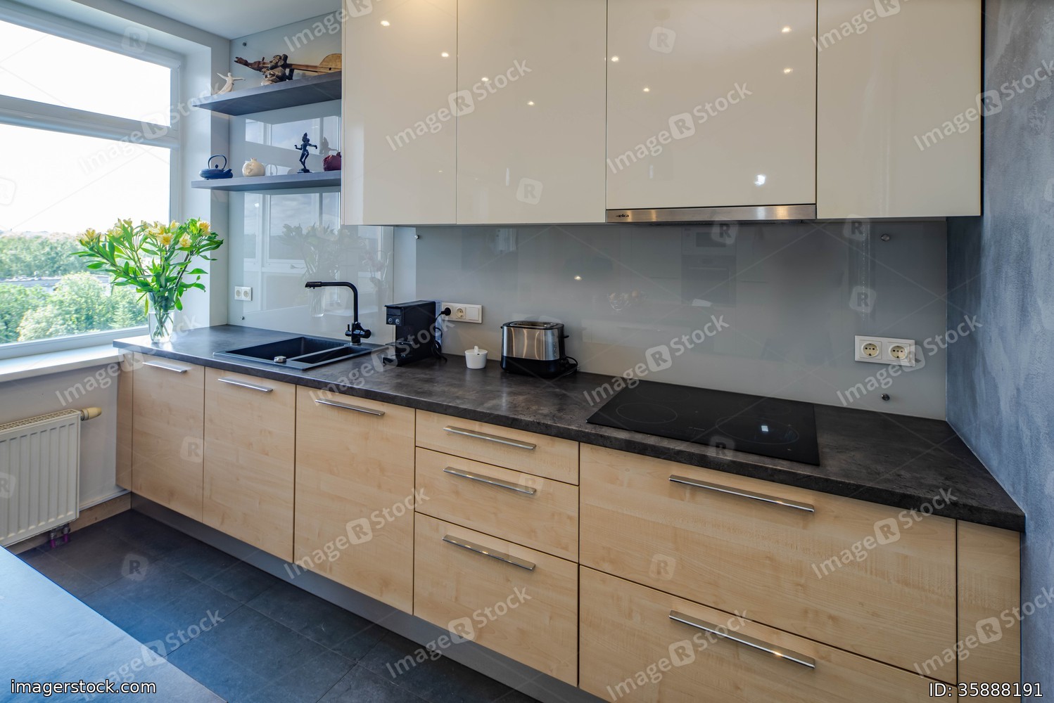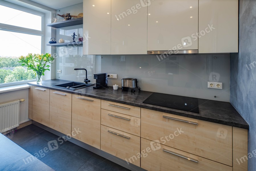 Contemporaru interior of kitchen. Wooden kitchen set and white cabinets. Flowers in vase.