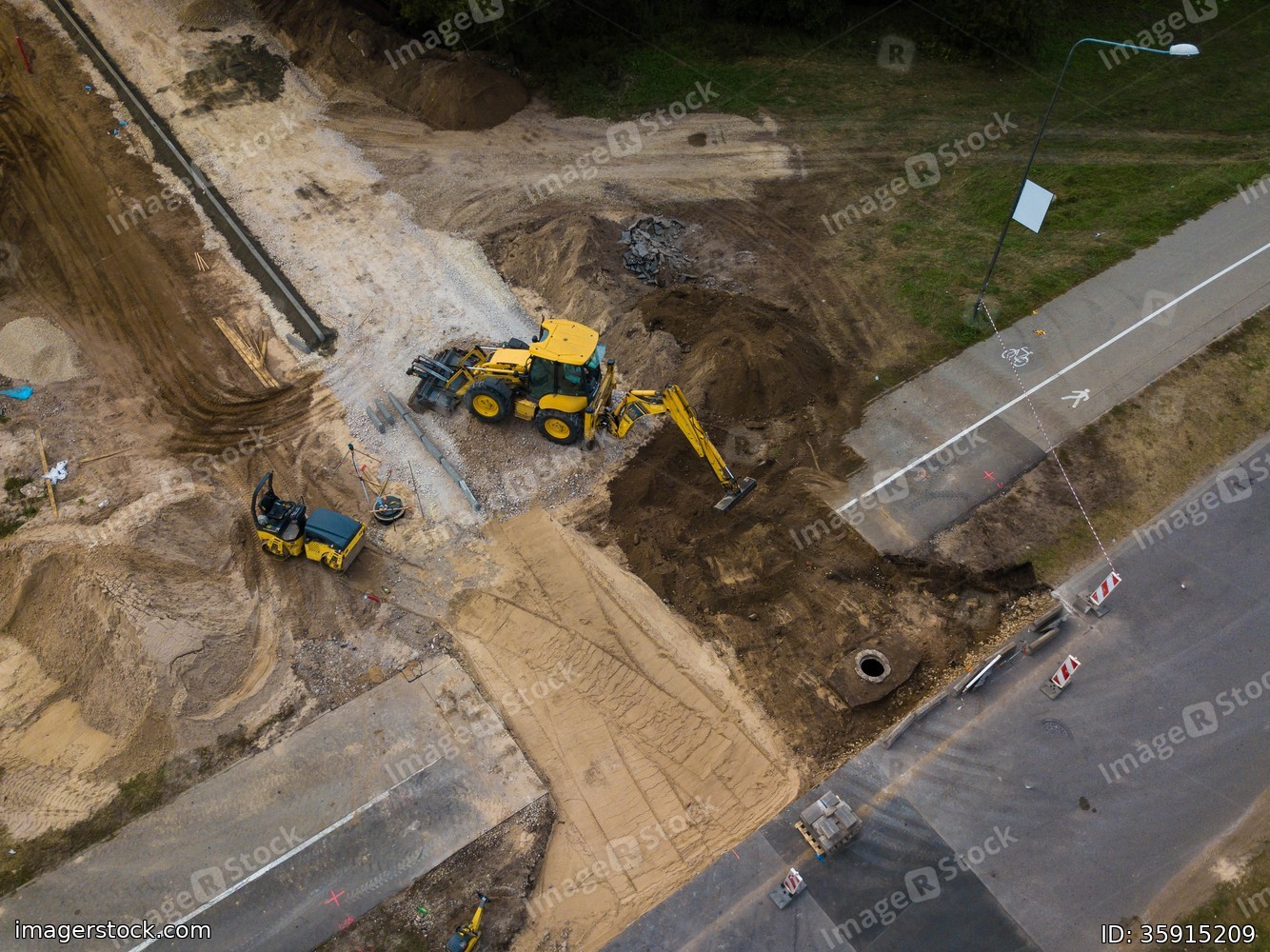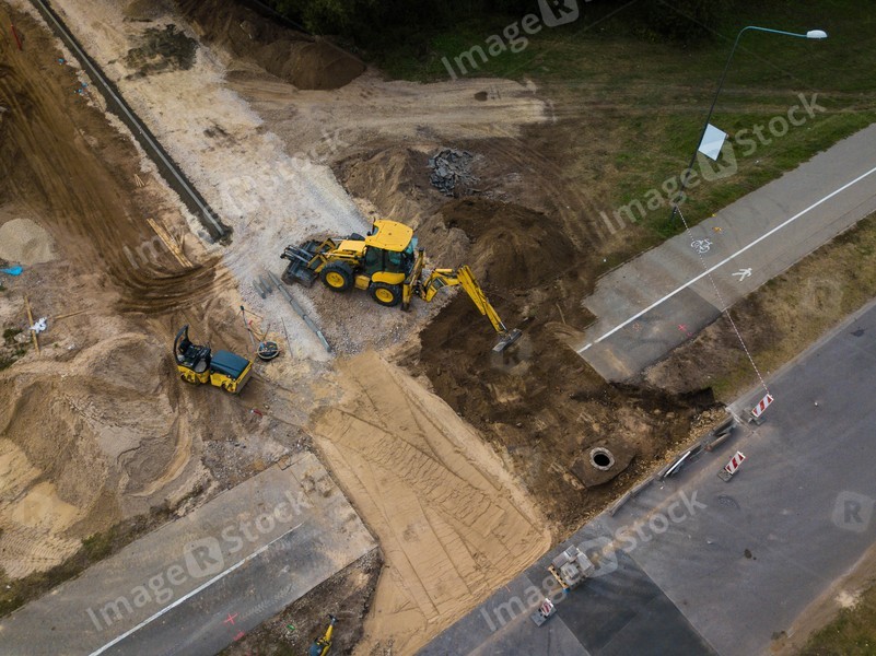 Aerial view of road construction works. Heavy machinery and construction equipment. Black and white.
