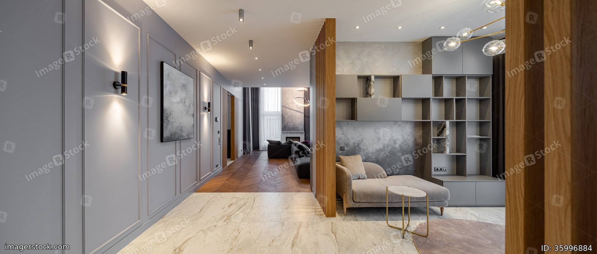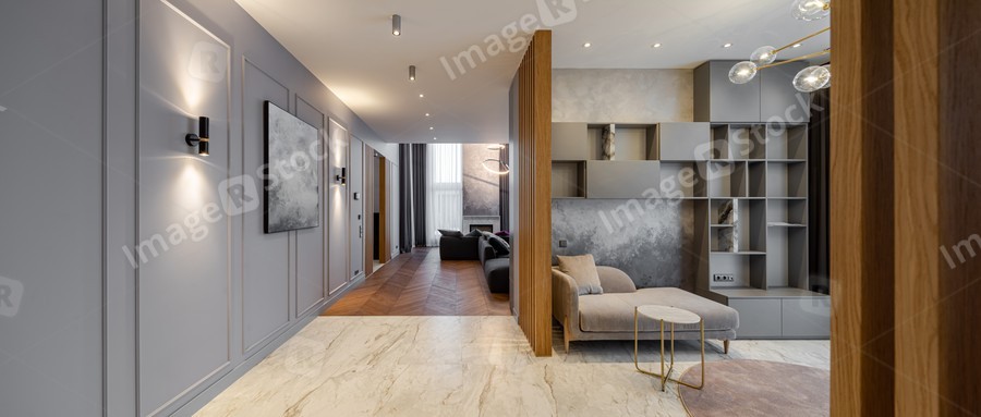 Modern interior of luxury private house. Grey tones. Wooden design.
