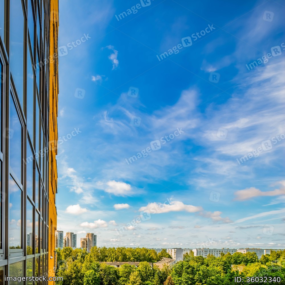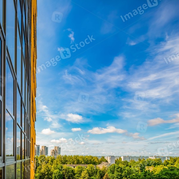 View from window of city at sunny summer day. Modern exterior of glass building. Glass wall.