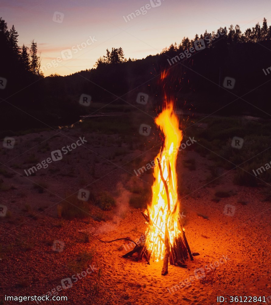 Landscape of forest and river at twilight. Huge bonfire. Midsummer Ligo celebration. Purple tones.
