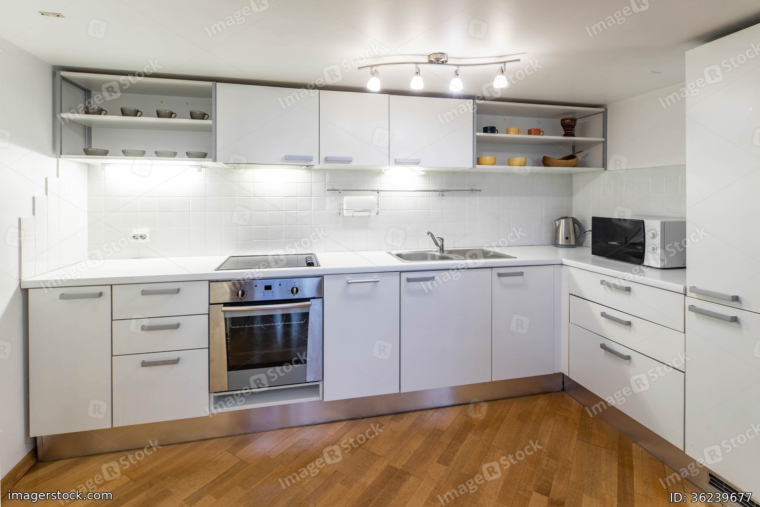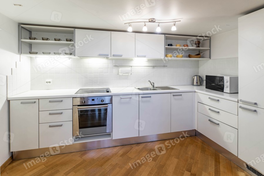 Kitchen in studio apartment. White interior. Wooden floor. White kitchen set.