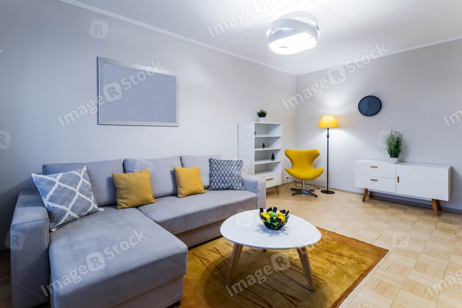 Contemporary interior of living room in modern flat. Home design. Cozy furniture. Coffee table. White shelf. Decorative plants. Floor lamp.