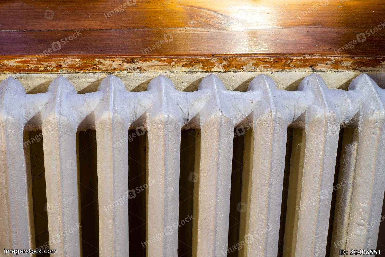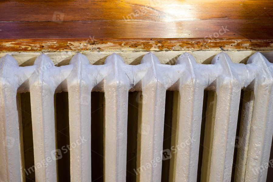 White heating battery under the wooden windowsill. Interior of apartment.