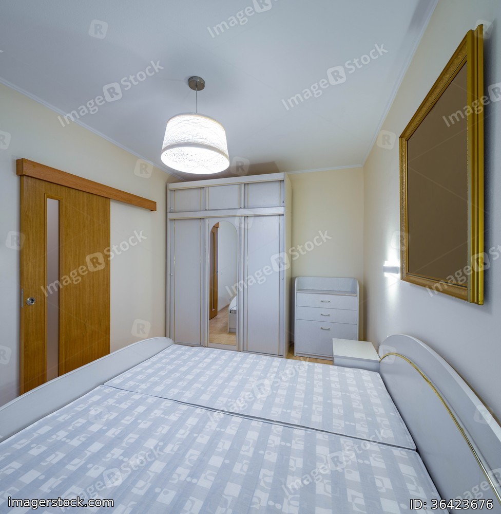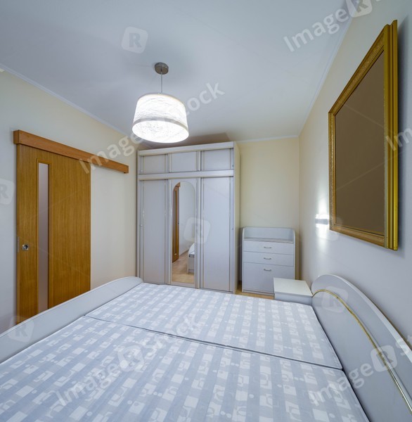 Modern interior of bedroom in apartment. White furniture. Sliding wooden door. Wardrobe with mirror.