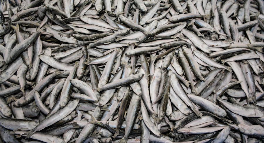 Close-up of fresh sprat in fish market. Winter fishing. Small silver fish.