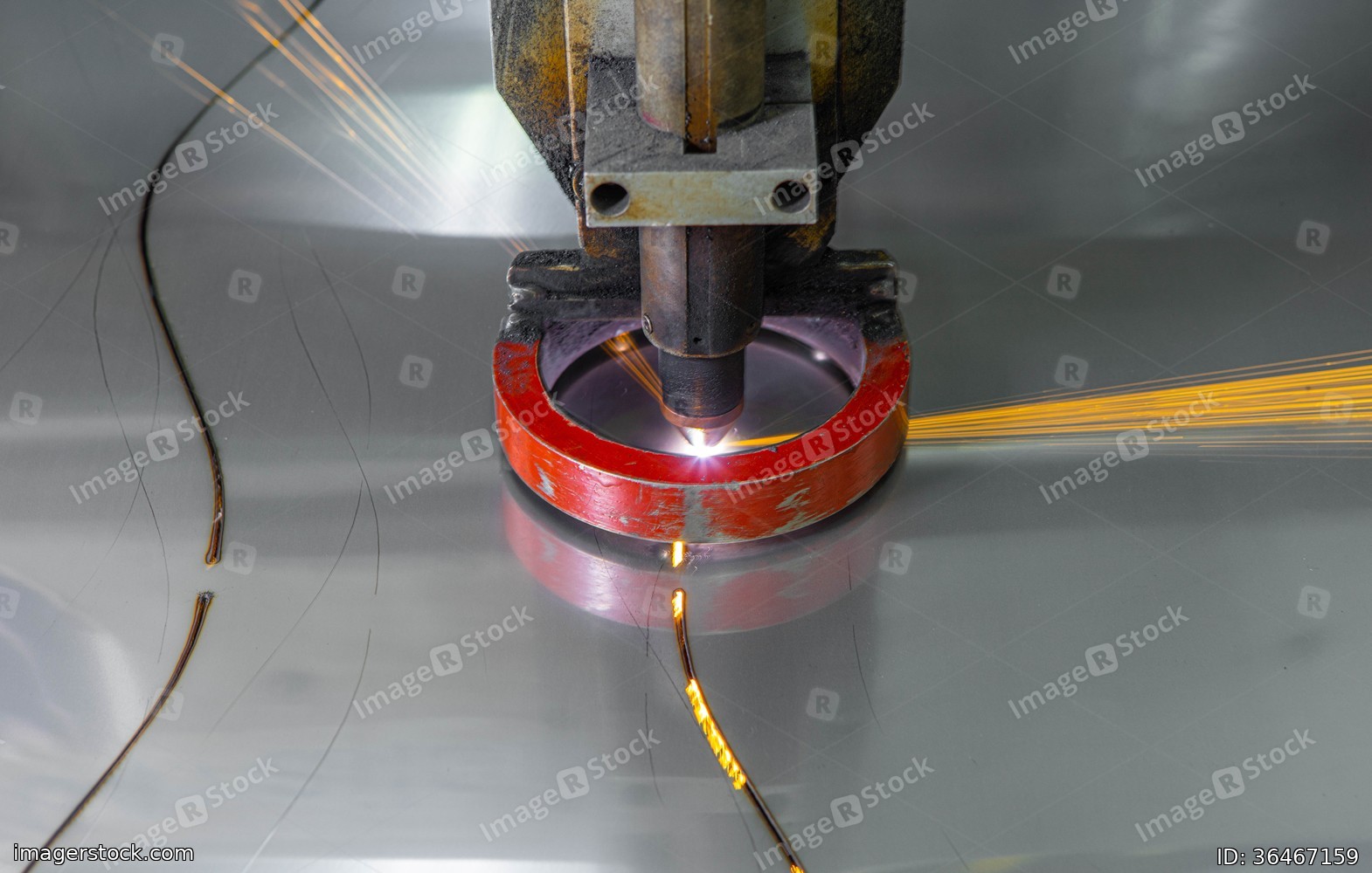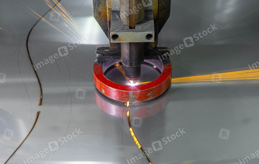 Plasma cutting of metal. Sparks fly from laser.