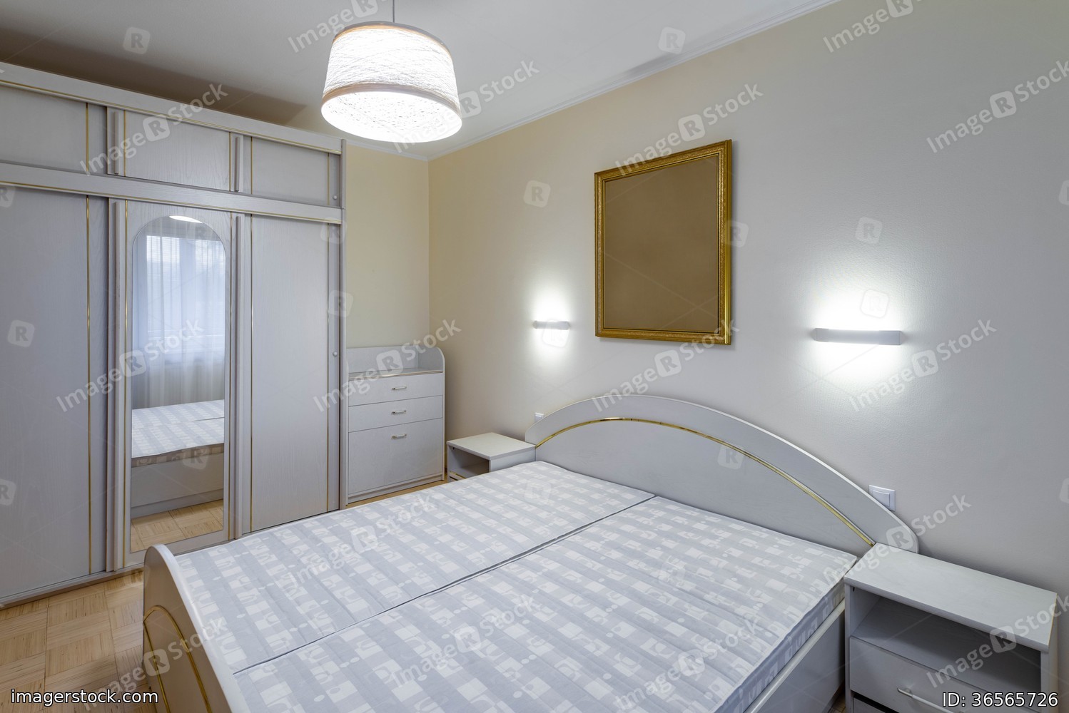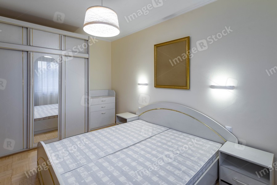 Contemporary interior of bedroom in flat. Sliding door wardrobe with mirror. White dresser, bed and nightstands.