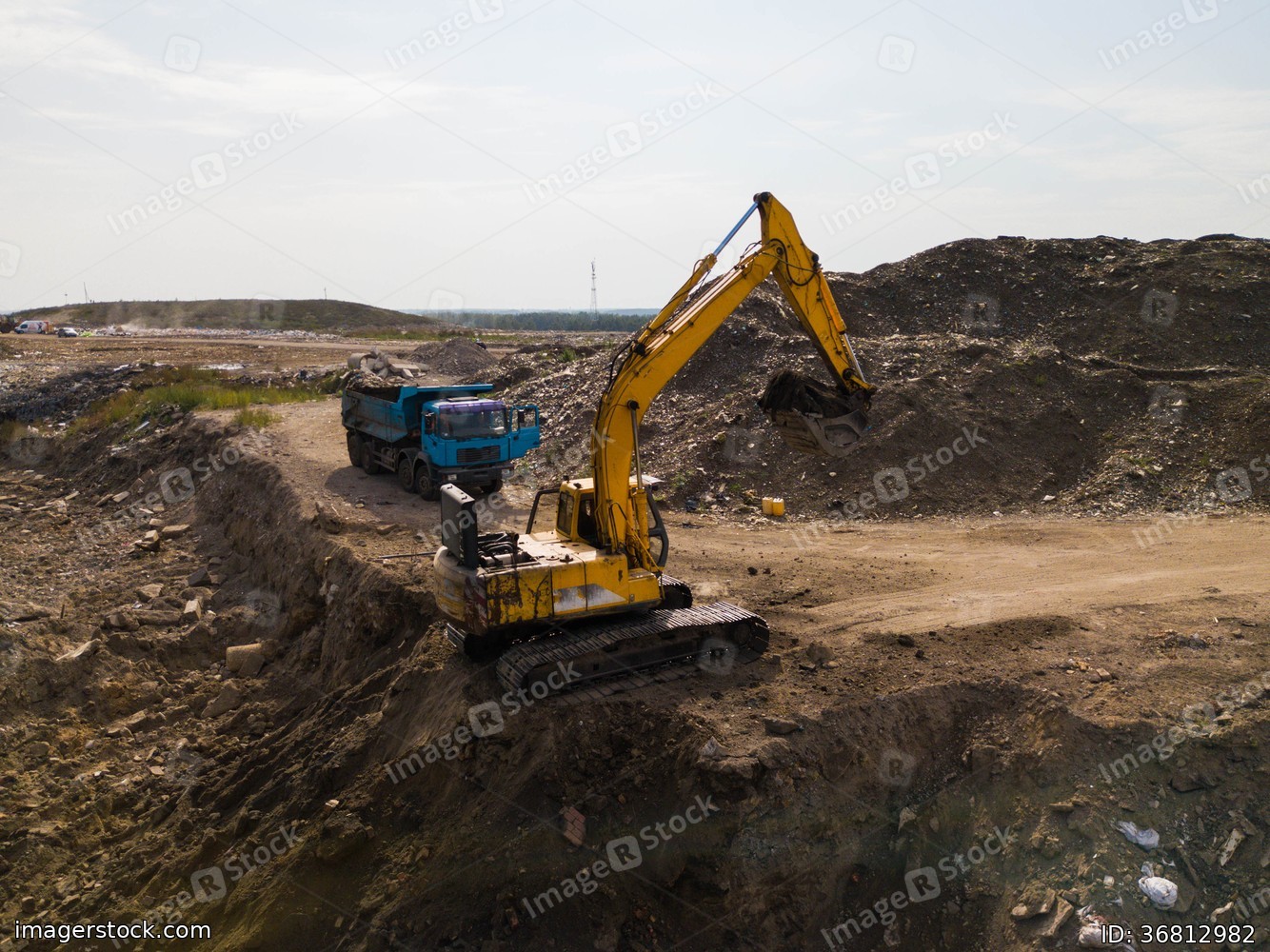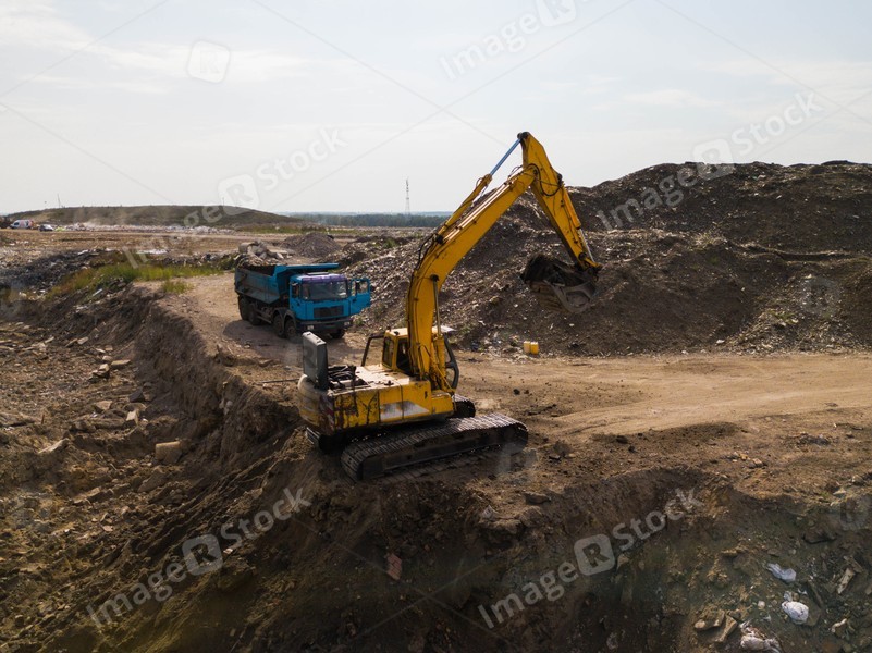 Construction works. Earthmoving at open pit mining. Heavy equipment. Yellow excavator and blue truck.