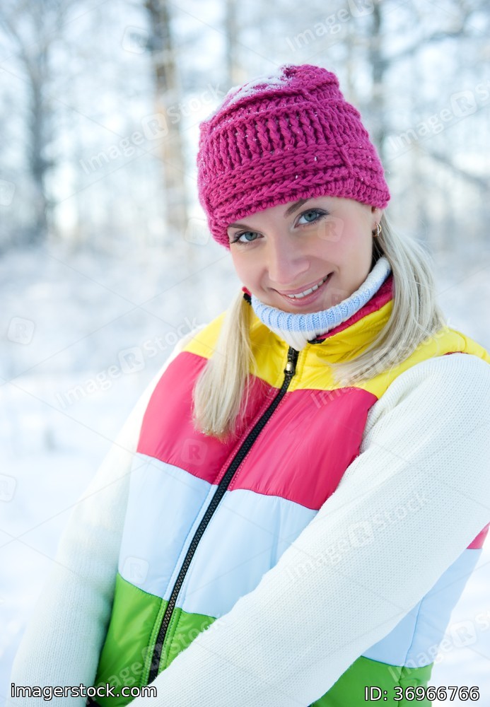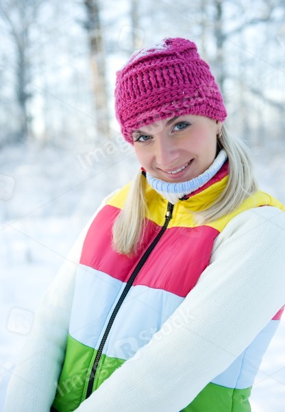 Frozen beautiful woman in winter clothing outdoors